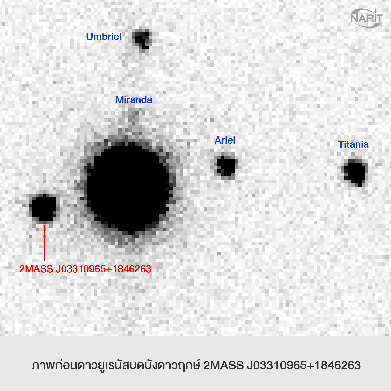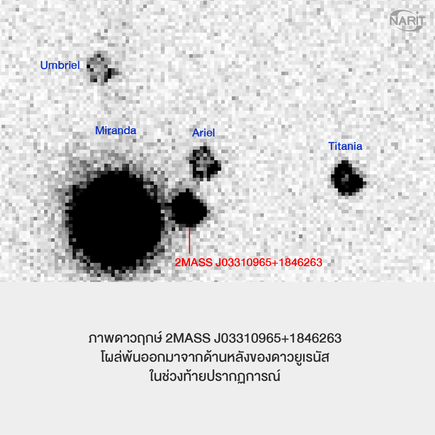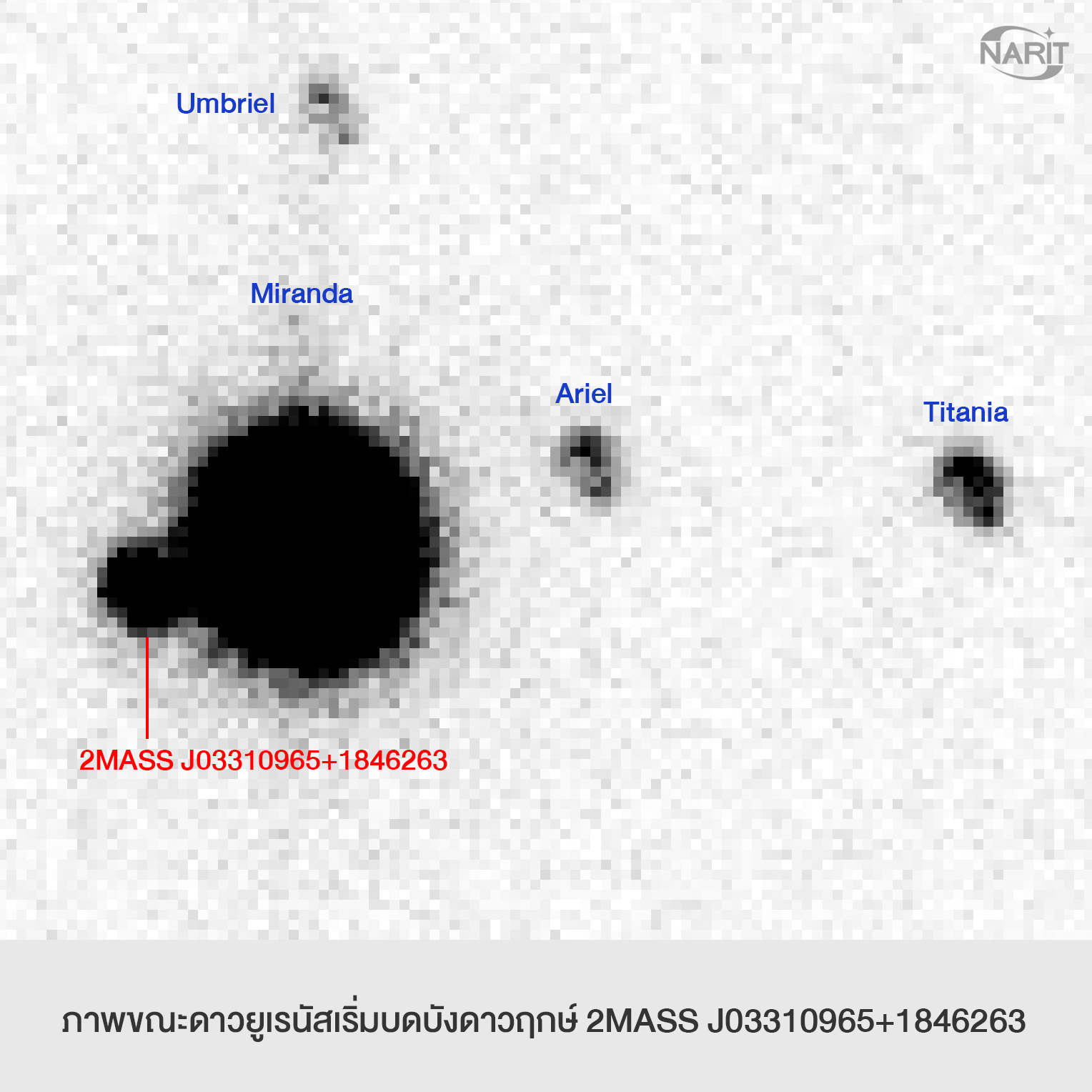 ดร. ศรัณย์ โปษยะจินดา ผู้อำนวยการสถาบันวิจัยดาราศาสตร์แห่งชาติ เปิดเผยว่า คืนวันที่ 13 พฤศจิกายน 2567 ตามเวลาในประเทศไทย เกิดปรากฏการณ์ดาราศาสตร์ “ดาวยูเรนัสบังดาวฤกษ์” ซึ่ง NASA Langley Research Center ได้เชิญหอดูดาวขนาดใหญ่หลายแห่งทั่วโลก รวมถึงหอดูดาวเฉลิมพระเกียรติ 7 รอบ พระชนมพรรษา หรือ หอดูดาวแห่งชาติ บนดอยอินทนนท์ อำเภอจอมทอง จังหวัดเชียงใหม่ ให้เข้าร่วมสังเกตการณ์และเก็บข้อมูลปรากฏการณ์ในครั้งนี้ด้วย คืนดังกล่าว นักดาราศาสตร์ NARIT ได้ใช้กล้องโทรทรรศน์แห่งชาติ ขนาดเส้นผ่านศูนย์กลาง 2.4 เมตร ร่วมเก็บข้อมูลโดยบันทึกภาพดาวยูเรนัสขณะกำลังบดบังดาวฤกษ์ 2MASS J03310965+1846263 ที่มีค่าอันดับความสว่างปรากฏประมาณ 13 นอกจากนี้ ภาพที่บันทึกได้ยังปรากฏให้เห็นดวงจันทร์บริวารขนาดใหญ่ของดาวยูเรนัส จำนวน 4 ดวง ได้แก่ มิแรนดา อัมเบรียล แอเรียล และไททาเนีย รวมถึงปรากฏให้เห็นวงแหวนบาง ๆ ของดาวยูเรนัสที่มีลักษณะตั้งฉากเมื่อมองจากโลก