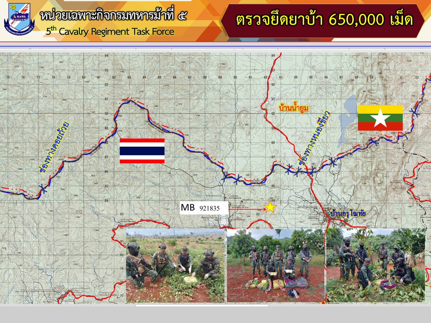 ฉก.ม.5 กกล.ผาเมืองปะทะกลุ่มขบวนการค้ายาบริเวณช่องทางร้อยล้าน ต.เมืองนะ อ.เชียงดาว จังหวัดเชียงใหม่  พบยาบ้า 650,000 เม็ด