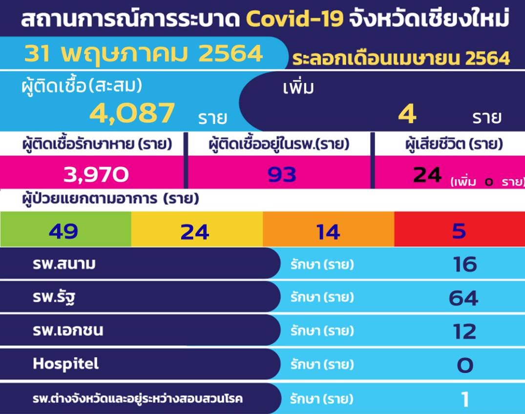 ดร.ทรงยศ คำชัย หัวหน้ากลุ่มงานควบคุมโรคติดต่อ เปิดเผยว่า วันนี้จังหวัดเชียงใหม่พบผู้ติดเชื้อรายใหม่จำนวน 4 ราย โดยทั้งหมดไม่มีความเกี่ยวข้องกับคลัสเตอร์ใด ๆ ที่มีอยู่ แต่มีประวัติเสี่ยงสัมผัสในครอบครัวและเดินทางไปในพื้นที่เสี่ยง ทำให้ยอดผู้ติดเชื้อสะสมเป็น 4,087 ราย รักษาหายแล้ว 3,970 ราย คิดเป็นร้อยละ 97 ของผู้ติดเชื้อทั้งหมด ยังคงมีผู้รักษาตัวอยู่ในโรงพยาบาลทุกประเภท จำนวน 93 ราย ไม่มีผู้เสียชีวิตเพิ่ม ทำให้ยอดผู้เสียชีวิตสะสมของจังหวัดเชียงใหม่อยู่ที่ 24 ราย ขณะที่กลุ่มผู้ติดเชื้อที่ยังรักษาตัวอยู่นั้น แยกเป็นกลุ่มผู้ป่วยที่ไม่มีอาการหรืออาการเล็กน้อย (สีเขียว) 49 ราย อาการปานกลาง (สีเหลือง) 24 ราย อาการค่อนข้างหนัก (สีส้ม) 14 ราย และผู้ป่วยอาการหนัก (สีแดง) 5 ราย