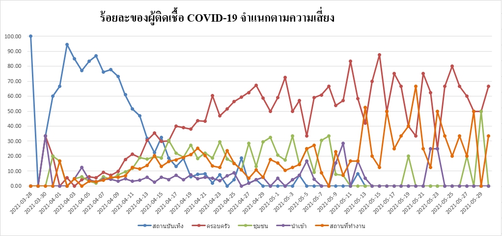 การตรวจคัดกรองกลุ่มเสี่ยงเมื่อวานนี้ (30 พ.ค. 64) ทำการตรวจไปจำนวน 525 ราย พบผู้มีผลบวกร้อยละ 0.57 ในภาพรวมตั้งแต่เริ่มระบาดในระลอกที่ 3 ช่วงต้นเดือนเมษายนเป็นต้นมา ได้ทำการตรวจกลุ่มเสี่ยงไปกว่า 180,000 ราย พบผู้มีผลบวกเพียงร้อยละ 3.96 สำหรับปัจจัยเสี่ยงที่เป็นสาเหตุหลักของการติดเชื้อในจังหวัดเชียงใหม่ พบว่าการสัมผัสในครอบครัวยังคงสูง ขณะที่การสัมผัสในชุมชนและสถานที่ทำงานพบน้อยลง ส่วนการนำเข้ามาจากต่างพื้นที่ไม่พบมา 3-4 วันแล้ว อย่างไรก็ตามสถานการณ์ระดับประเทศโดยเฉพาะกรุงเทพมหานครและปริมณฑล ยังมีการระบาดอย่างต่อเนื่อง จึงขอให้ประชาชนช่วยกันสอดส่อง แม้ว่าช่องทางบกจะไม่มีการตั้งด่านสกัดกั้นแต่ผู้ที่เดินทางเข้ามาก็ต้องสแกน CM-CHANA และรายงานตัวต่อเจ้าหน้าที่ทุกครั้ง โดยหากพักที่โรงแรมทางโรงแรมจะช่วยตรวจสอบ แต่ถ้าพักที่บ้านต้องเป็นหน้าที่ของเจ้าบ้านที่จะเป็นผู้ตรวจสอบ ทั้งนี้เมื่อลงทะเบียนเข้าจังหวัดเชียงใหม่ผ่าน CM-CHANA แล้ว ทีมโควิดชุมชนหรือทีมโควิดหมู่บ้านจะเป็นผู้ติดตามตัวต่อไป เพื่อไม่ให้เกิดการระบาดขึ้นอีก