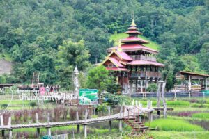 สะพานไม้ไผ่เป็นสะพานที่ยาวและสวยที่สุดอีกแห่งหนึ่งก็ว่าได้ เนื่องจากทอดยาวกลางทุ่งนาและล้อมรอบด้วยภูเขาภาพที่ถ่ายจึงเป็นภาพที่สวยท่ามกลางความเขียวของนาข้าวที่เป็นวิถีชีวิตของชาวบ้านบริเวณนั้น ส่วนที่วัดพระธาตุจองทองนักท่องเที่ยวสามารถกราบพระเพื่อขอพรให้ประสบความสำเร็จตามที่ทุกท่านปราถณา รวมทั้งการได้มีโอกาสใส่บาตรตอนเช้าบนสะพานซูตองเป้ ก็จะเป็นประสบการณ์ที่สงบและศักดิ์สิทธิ์ได้เช่นกัน