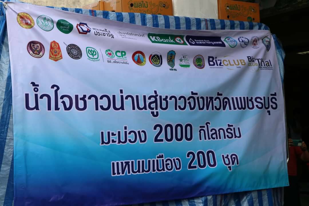 โดยผู้แทนบริษัทประชารัฐรักสามัคคีน่าน (วิสาหกิจเพื่อสังคม) จำกัด ได้กล่าวว่าจังหวัดน่านตอนที่บ้านห้วยขาบเกิดเหตุดินโคลนถล่ม ทางจังหวัดเพชรบุรีและจังหวัดอื่นๆ ได้ส่งความช่วยเหลือสนับสนุนเงินมาช่วยเหลือจำนวน 10,000 บาท ทางบริษัทฯได้ส่งไปช่วยเหลือที่บ้านห้วยขาบไปแล้วบางส่วน และมีเงินเหลืออยู่ตอนหลังในเขตเมืองน่านเกิดน้ำท้วมโดยเฉพาะในพื้นที่ตำบลเมืองจัง และฝายแก้ว บริษัทฯ จึงขอมติกรรมการเอาเงินส่วนที่เหลือไปช่วยเรื่องน้ำท้วม และมาในวันนี้บริษัท ประชารัฐรักสามัคคีน่าน (วิสาหกิจเพื่อสังคม) จำกัด จึงได้นำมะม่วงจากตำบลเมืองจังส่งไปช่วยเหลือสนับสนุนบุคลากรทางการแพทย์ และคนเพชรบุรีที่โรงพยาบาลสนามจังหวัดเพชรบุรีเพื่อตอบแทนน้ำใจของคนเพชรบุรี