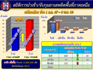 ทั้งนี้ในห้วงเดือนที่ผ่านมาหน่วยบัญชาการสกัดกั้นและปราบปรามยาเสพติดสารตั้งต้นและเคมีภัณฑ์ชายแดนภาคเหนือได้สกัดกั้นยาเสพติดในพื้นที่อย่างต่อเนื่อง โดยมีเหตุการณ์สำคัญ 26 เหตุการณ์ มีการปะทะกับกลุ่มขบวนการค้ายาเสพติด 7 ครั้ง ตรวจยึดจับกุม 19 ครั้ง สามารถตรวจยึดยาบ้าได้กว่า 42.51 ล้านเม็ด, ไอซ์ 572 กก., เฮโรอีน 140 กก., คีตามีน 155 กก. จับกุมผู้ต้องหา 21 ราย,กลุ่มขบวนการเสียชีวิต 8 ศพ ซึ่งเมื่อเปรียบเทียบในห้วงเวลาเดียวกันกับปีที่ผ่านมา พบว่า สามารถตรวจยึดยาบ้าเพิ่มมากขึ้น จำนวน 11.8 ล้านเม็ดเศษ คิดเป็นร้อยละ 38.57