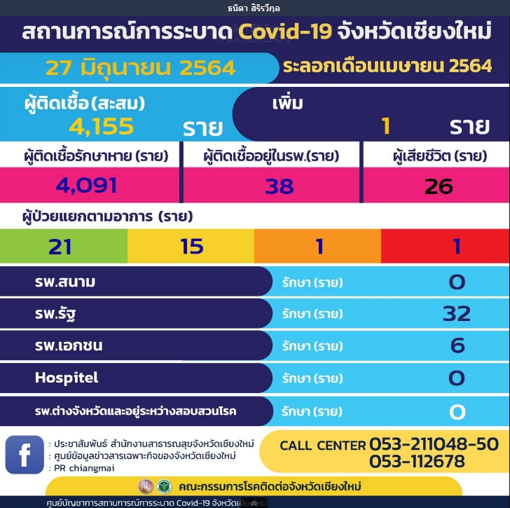 ดร.ทรงยศ คำชัย หัวหน้ากลุ่มงานควบคุมโรคติดต่อ สำนักงานสาธารณสุขจังหวัดเชียงใหม่ เปิดเผยว่า วันนี้จังหวัดเชียงใหม่พบผู้ติดเชื้อรายใหม่เพิ่ม 1 ราย ทำให้ยอดผู้ติดเชื้อสะสมเป็น 4,155 ราย รักษาหายแล้ว 4,091 ราย ยังคงมีผู้รักษาตัวอยู่ในโรงพยาบาลทุกประเภท จำนวน 38 ราย แยกเป็นโรงพยาบาลรัฐ 32 ราย โรงพยาบาลเอกชน 6 ราย ไม่มีผู้เสียชีวิตเพิ่ม ทำให้ยอดผู้เสียชีวิตสะสมของจังหวัดเชียงใหม่ยังอยู่ที่ 26 ราย ขณะที่กลุ่มผู้ติดเชื้อที่ยังรักษาตัวอยู่นั้น แยกเป็นกลุ่มผู้ป่วยที่ไม่มีอาการหรืออาการเล็กน้อย (สีเขียว) 21 ราย อาการปานกลาง (สีเหลือง) 15 ราย อาการค่อนข้างหนัก (สีส้ม) 1 ราย และผู้ป่วยอาการหนัก (สีแดง) 1 ราย