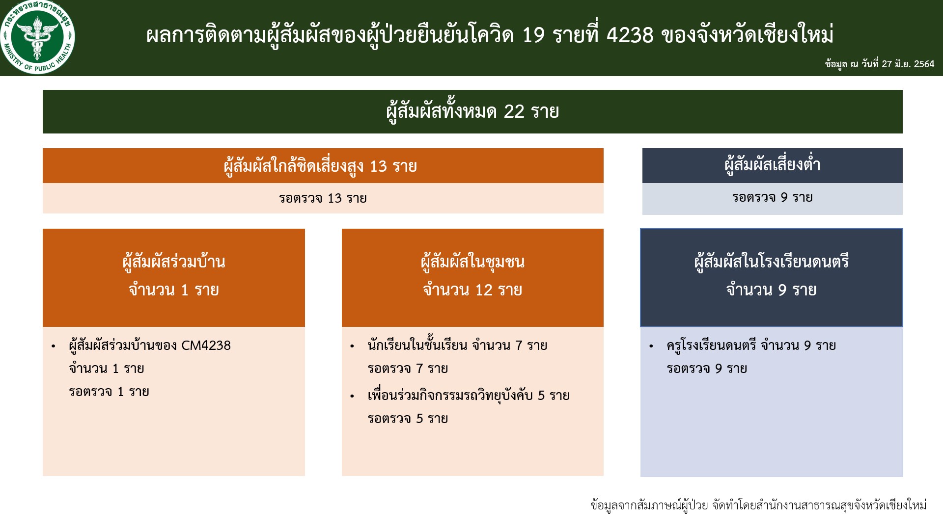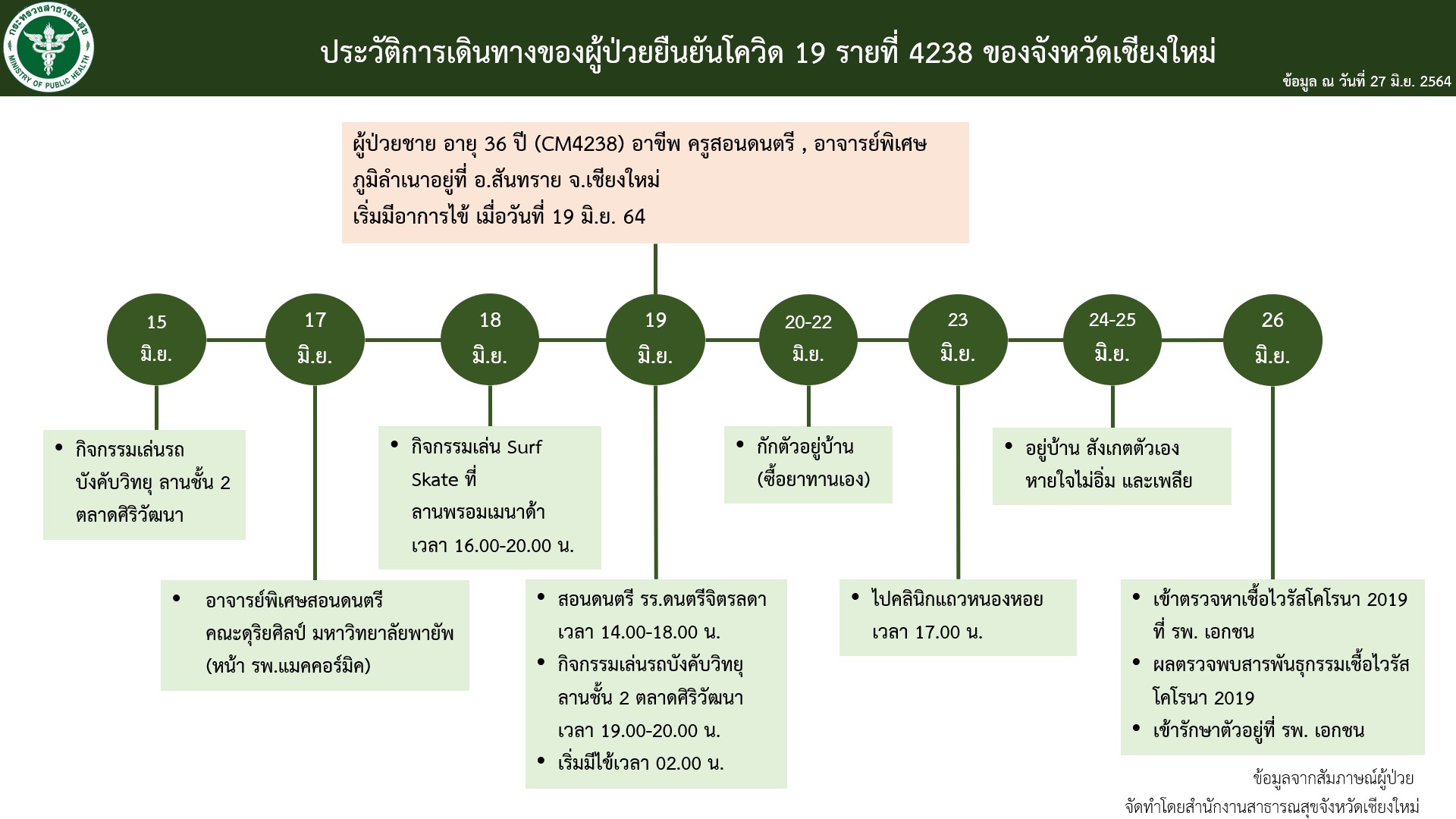 รายละเอียดผู้ติดเชื้อรายใหม่ 1 รายวันนี้ เป็นชายไทย อายุ 36 ปี รหัส CM 4238 เป็นครูสอนดนตรีและอาจารย์พิเศษ มีภูมิลำเนาในพื้นที่อำเภอสันทราย วันที่ 15 มิถุนายน เล่นรถบังคับวิทยุที่ลานชั้น 2 ตลาดศิริวัฒนา วันที่ 17 มิถุนายน สอนดนตรีที่วิทยาลัยดุริยศิลป์ มหาวิทยาลัยพายัพ วันที่ 18 มิถุนายน เล่น Surf Skate ที่ลานห้างสรรพสินค้าพรอมเมนาดา วันที่ 19 มิถุนายน สอนดนตรีที่โรงเรียนดนตรีจิตรลดา ไปเล่นรถบังคับและเริ่มมีอาการไข้ตอนกลางคืน วันที่ 20-22 มิถุนายน กักตัวอยู่ที่บ้าน วันที่ 23 มิถุนายน ไปตรวจที่คลินิกแถวหนองหอย วันที่ 24-25 มิถุนายน กักตัวที่บ้านแต่อาการยังไม่ดีขึ้น วันที่ 26 มิถุนายน จึงเข้ารับการตรวจและพบเชื้อ โดยจำนวนผู้สัมผัสขณะนี้มี 22 ราย เป็นผู้สัมผัสเสี่ยงสูง 13 ราย สัมผัสร่วมบ้าน 1 ราย ผลเป็นบวก ซึ่งจะรายงานยอดในวันพรุ่งนี้ (28 มิ.ย. 64) ส่วนผู้สัมผัสในชุมชน 12 ราย นักเรียนในโรงเรียนดนตรี 7 ราย อยู่ระหว่างการติดตามตัว และเพื่อนที่ร่วมกิจกรรมรถวิทยุบังคับ 5 ราย กำลังเข้ารับการตรวจ ส่วนนักศึกษาวิทยาลัยดุริยศิลป์ อยู่ระหว่างการสอบสวน ขณะที่ผู้เสี่ยงต่ำ 9 ราย คือครูในโรงเรียนสอนดนตรี กำลังแจ้งให้เข้ารับการตรวจ หากทั้งหมดผลเป็นลบก็จะต้องกักตนเองอย่างเคร่งครัด ส่วนผู้ที่เล่น Surf Skate เป็นกลุ่มเสี่ยงต่ำ ให้สังเกตอาการ เนื่องจากผู้ติดเชื้อยืนยันว่าเล่นคนเดียว ไม่ได้สัมผัสกับใคร