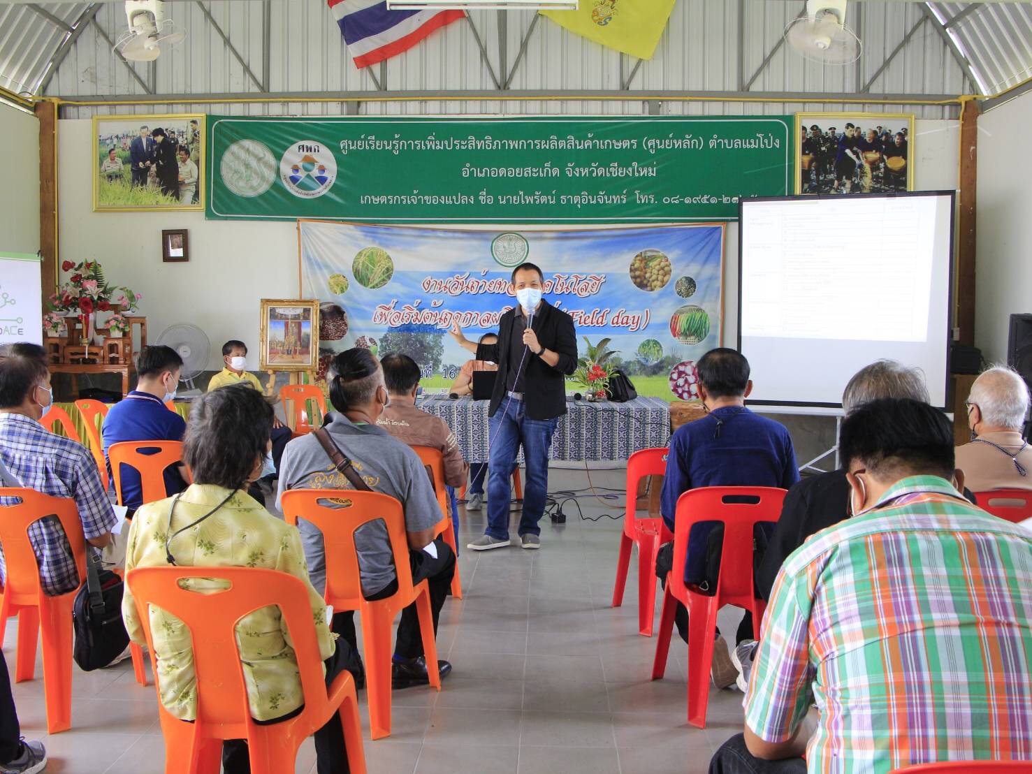 นางเขมวรรณ ดวงจันทร์ เกษตรจังหวัดเชียงใหม่ เป็นประธานเปิดการอบรมพัฒนาเกษตรกรผู้นำ ศพก.เครือข่าย ภายใต้โครงการศูนย์เรียนรู้การเพิ่มประสิทธิภาพการผลิตสินค้าเกษตรนางกัลยา ชาติดี หัวหน้ากลุ่มยุทธศาสตร์และสารสนเทศ กล่าวรายงาน นางละออ ริญญา เกษตรอำเภอดอยสะเก็ด กล่าวต้อนรับ นายไพรัตน์ ธาตุอินจันทร์ เกษตรกรต้นแบบร่วมถ่ายทอดเทคโนโลยีดังกล่าว ณ ศูนย์เรียนรู้การเพิ่มประสิทธิภาพการผลิตสินค้าเกษตร (ศกพ.) ต.แม่โป่ง อ.ดอยสะเก็ด จ.เชียงใหม่