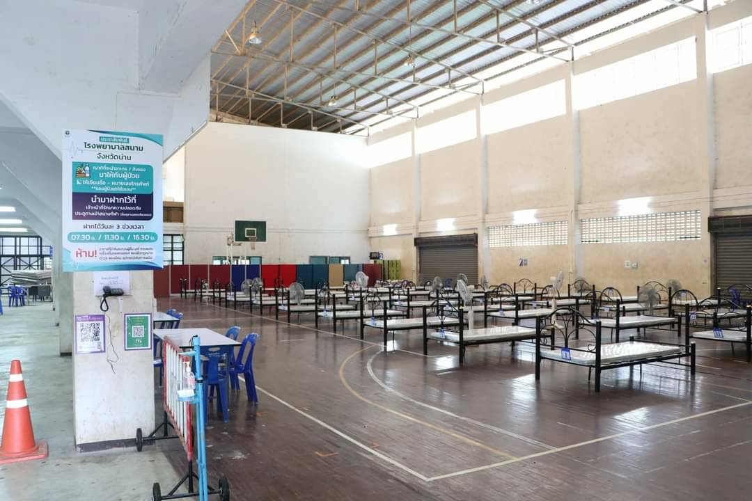 ที่โรงยิม สนามกีฬาองค์การบริหารส่วนจังหวัดน่าน โรงพยาบาลสนามจังหวัดน่าน นายวิบูรณ์ แววบัณฑิต รองผู้ว่าราชการจังหวัดน่าน พร้อมคณะอนุกรรมการโรคติดต่อจังหวัดน่าน ด้านการจัดตั้งโรงพยาบาลสนาม และสถานที่กักกันตัวจังหวัดน่าน ลงพื้นที่ตรวจความพร้อมการเปิดใช้โรงพยาบาลสนามอีกครั้งในวันนี้ หลังพบยอดผู้ป่วยโควิด 19 จังหวัดน่าน รักษาตัวในโรงพยาบาล 82 ราย