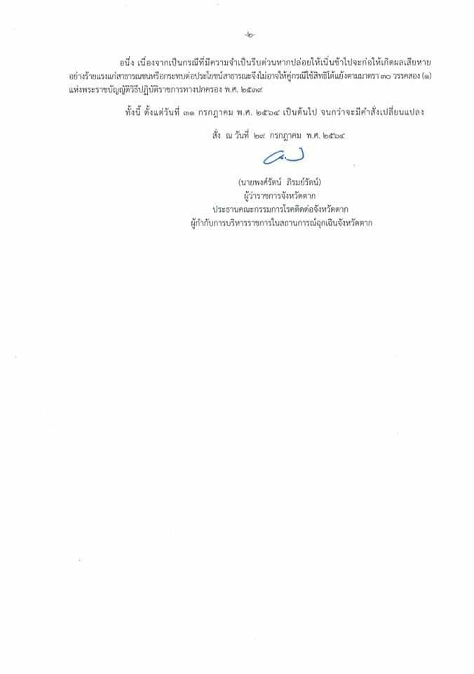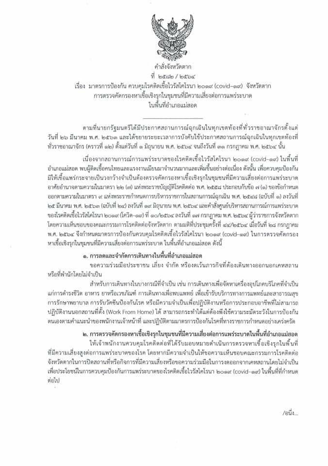 นายพงศ์รัตน์ ภิรมย์รัตน์ ผู้ว่าราชการจังหวัดตาก ประธานคณะกรรมการโรคติดต่อจังหวัดตาก ผู้กำกับการบริหารราชการในสถานการณ์ฉุกเฉินจังหวัดตาก ได้มีคำสั่งจังหวัดตาก ที่ 2582/2564 เรื่อง มาตรการป้องกัน ควบคุมโรคติดเชื้อไวรัสโคโรนา 2019 (covid-19) จังหวัดตาก การตรวจคัดกรองหาเชื้อเชิงรุกในชุมชนที่มีความเสี่ยงต่อการแพร่ระบาดในพื้นที่อำเภอแม่สอด หลังพบสถานการณ์การแพร่ระบาดของโรคในพื้นที่อำเภอแม่สอด มีผู้ติดเชื้อคนไทยและแรงงานเมียนมาจำนวนมาก และเพิ่มขึ้นอย่างต่อเนื่อง ซึ่งข้อมูล ณ วันที่ 30 กรกฎาคม 2564 เฉพาะพื้นที่อำเภอแม่สอด พบผู้ติดเชื้อรายใหม่ 176 ราย รวมผู้ป่วยระลอกใหม่สะสม ตั้งแต่ 1 เมษายน – 30 กรกฎาคม 2564 จำนวน 3,281 ราย ด้วยกัน
