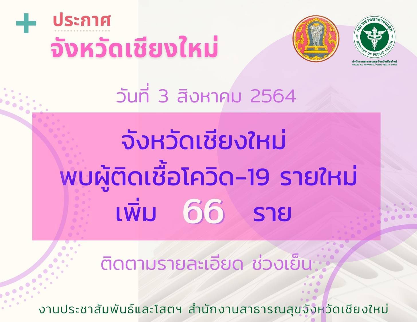 จังหวัดเชียงใหม่ พบผู้ติดเชื้อโควิด-19 เพิ่ม 66 ราย โดยเป็นผู้ติดเชื้อในจังหวัดถึง 40 ราย และนำเข้าจากต่างจังหวัดอีก 26 ราย ทำให้ผู้ติดเชื้อสะสมเดือนกรกฎาคม 2564 อยู่ที่ 1,539 ราย