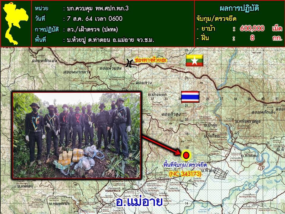 วันที่ 7 ส.ค. 64 เวลา 08.30 น.พล.ต.นฤทธิ์ ถาวรวงษ์ ผู้บัญชาการกองกำลังผาเมือง เปิดเผยว่า เมื่อ เวลา 04.00 ที่ผ่านมา กองบังคับการควบคุมทหารพราน ศูนย์ปฏิบัติการกองทัพภาคที่ 3 กองกำลังผาเมือง ( บก.ควบคุม ทพ.ศปก.ทภ.3 ) จัดกำลังลาดตระเวนเฝ้าตรวจพื้นที่ล่อแหลมตามแนวชายแดน บริเวณ บ.ห้วยปู ต.ท่าตอน อ.แม่อาย จังหวัดเชียงใหม่ ได้ตรวจการณ์พบกลุ่มบุคคล ประมาณ 7 – 8 คน แบกสัมภาระ เดินเข้ามาตามเส้นทางในภูมิประเทศ หน่วยทหารจึงได้แสดงตัวเพื่อขอทำการตรวจค้น แต่กลุ่มบุคคลดังกล่าว เมื่อพบเจ้าหน้าที่ได้ใช้อาวุธปืนยิงใส่เจ้าหน้าที่ ประมาณ 5 นาที ก่อนยิงสกัดเพื่อเปิดทางหนี ผลการปะทะฝ่ายเราปลอดภัย ต่อมาเมื่อเวลา 0600 ได้จัดกำลังเพิ่มเติมเพื่อเข้าตรวจสอบพื้นที่โดยรอบ และตรวจสอบพบ เป้ดัดแปลงจำนวน 6 เป้ ภายในบรรจุยาเสพติดประเภทที่ 1(ยาบ้า) จำนวนประมาณ 600,000 เม็ด และยาเสพติดให้โทษประเภท 2 (ฝิ่น) จำนวน 5 ก้อน น้ำหนัก 8 กิโลกรัม ปัจจุบันหน่วยได้นำของกลางนำส่ง เจ้าหน้าที่สถานีตำรวจแม่อาย เพื่อติดตามขยายผล และดำเนินคดีตามกฎหมายต่อไป