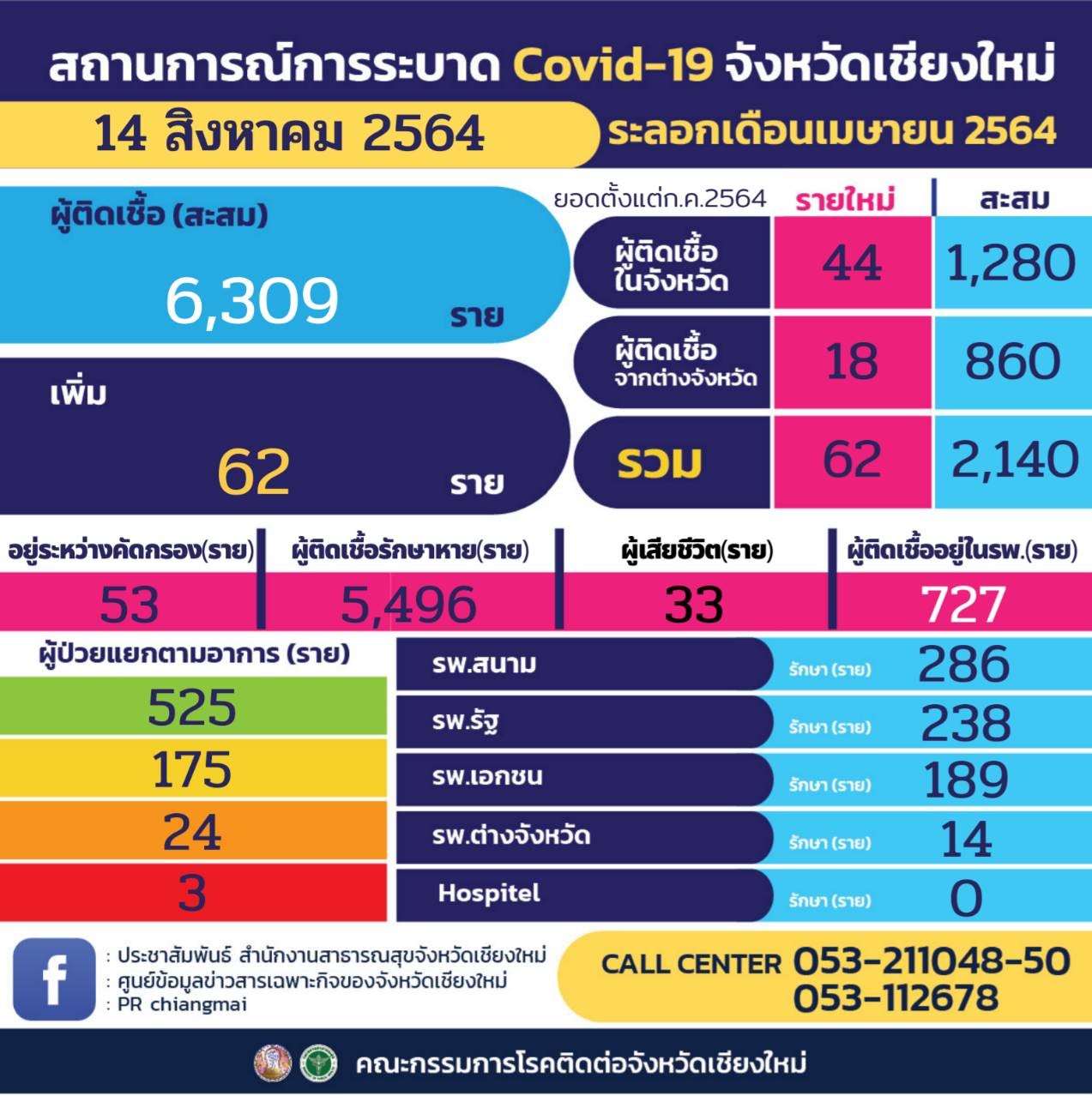 วันนี้ (14 ส.ค. 64) ที่ศูนย์บัญชาการสถานการณ์การระบาดโรค Covid-19 จังหวัดเชียงใหม่ ดร.ทรงยศ คำชัย หัวหน้ากลุ่มงานควบคุมโรคติดต่อ สำนักงานสาธารณสุขจังหวัดเชียงใหม่ แถลงสถานการณ์การระบาดโรค Covid-19 จังหวัดเชียงใหม่ประจำวัน ว่า วันนี้จังหวัดเชียงใหม่พบผู้ติดเชื้อรายใหม่ 62 ราย ซึ่งจากการตรวจคัดกรองกลุ่มเสี่ยง และผู้สัมผัส เมื่อวานนี้ (13 ส.ค. 64) ตรวจทั้งหมด 2,406 ราย พบผู้มีผลบวก 61 ราย คิดเป็นร้อยละ 2.54 นอกนั้นเป็นผู้มีผลบวกมาจากต่างจังหวัดขอกลับมารักษายังภูมิลำเนา ส่วนปัจจัยเสี่ยงในการติดเชื้อหลักๆ มาจากคลัสเตอร์อำเภอฮอด และการสัมผัสในครอบครัวเพิ่มสูงมากเช่นกัน ทำให้ภาพรวมการสัมผัสในครอบครัวมากถึงร้อยละ 23.6 สัมผัสจากต่างจังหวัดเพิ่มเป็นร้อยละ 15.6 สัมผัสในชุมชน เพิ่มเป็นร้อยละ 15.2 และสัมผัสในที่ทำงานลดลงเหลือ ร้อยละ 12.2