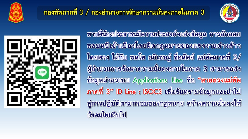 อย่างไรก็ตาม หากประชาชนพบเห็นการนำพาแรงงานต่างด้าวเข้าเมืองโดยผิดกฎหมาย ขอให้แจ้งเจ้าหน้าที่ทหารในพื้นที่ เพื่อนำไปสู่การปฏิบัติในการปราบปรามและการสกัดกั้นอย่างเป็นรูปธรรมตามกฎหมาย นอกจากนี้หากต้องการส่งข้อมูล การลักลอบหลบหนีเข้าเมืองโดยผิดกฎหมายของแรงงานต่างด้าวโดยตรง ให้กับ พลโท อภิเชษฐ์ ซื่อสัตย์ แม่ทัพภาคที่ 3/ผู้อำนวยการรักษาความมั่นคงภายในภาค 3 สามารถส่งข้อมูลผ่านระบบ Applications Line ชื่อ “สายตรงแม่ทัพภาคที่ 3” ID Line : ISOC3 เพื่อรับทราบข้อมูลและนำไปสู่การปฏิบัติตามกรอบของกฎหมาย สร้างความมั่นคงในพื้นที่