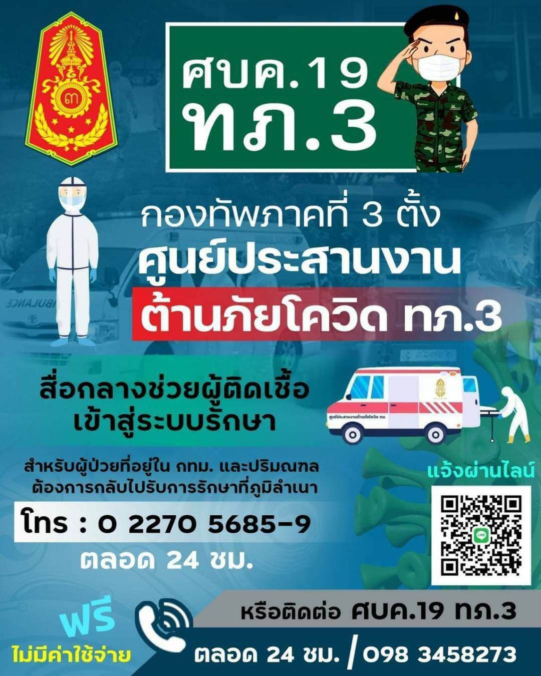 ศูนย์บริหารสถานการณ์โควิด – 19 กองทัพภาคที่ 3  ยังคงให้การช่วยเหลือประชาชนที่ได้รับผลกระทบจากสถานการณ์โรคโควิด ในพื้นที่ 17  จังหวัดภาคเหนือ   ตลอด 24 ชั่วโมง   สอบถามข้อมูลผ่านทางหมายเลขโทรศัพท์ 098 – 3458273