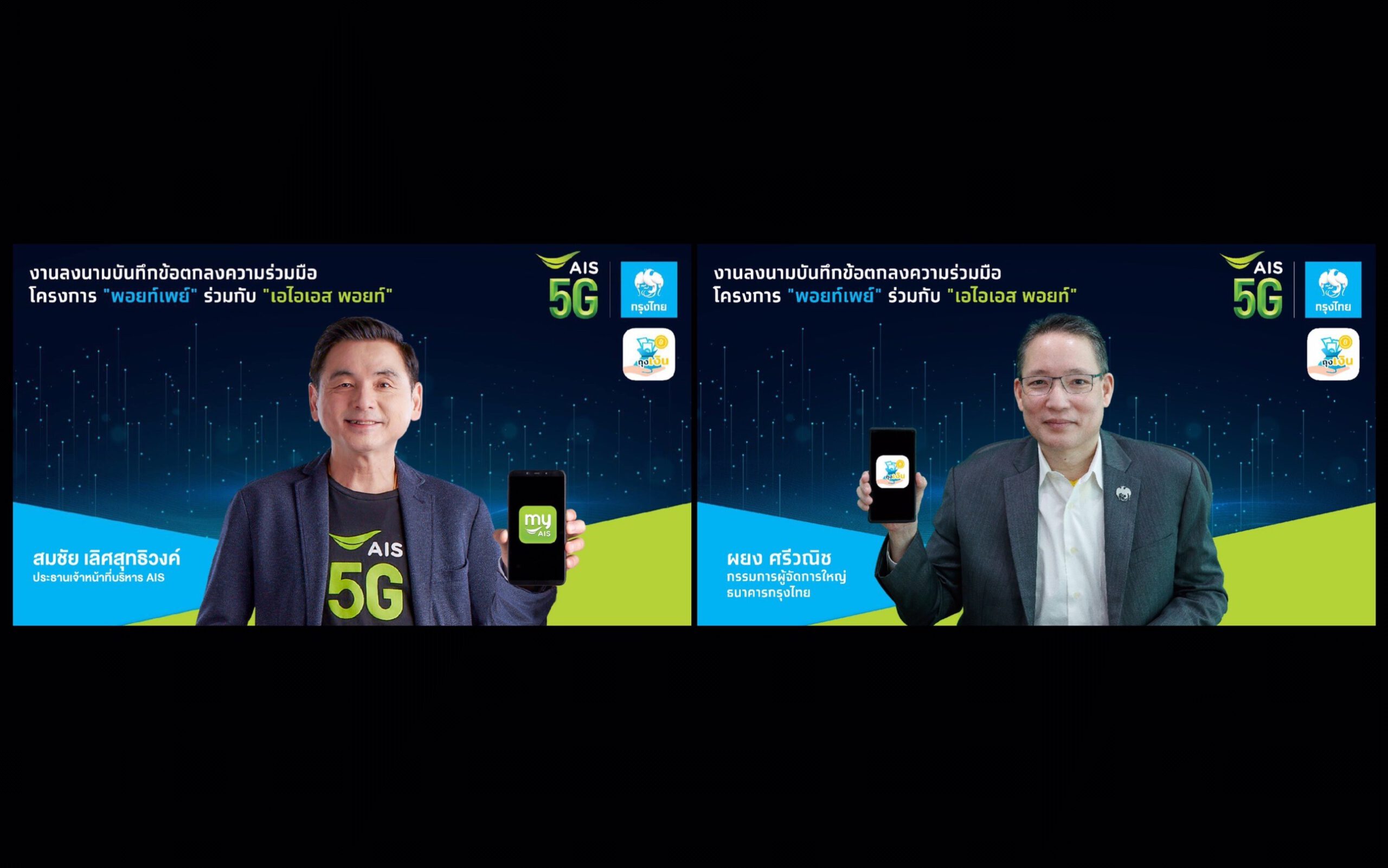 “ความร่วมมือในครั้งนี้ เป็นการผสานจุดแข็งของกรุงไทย ที่มีโครงสร้างพื้นฐานด้านดิจิทัลที่แข็งแกร่ง และช่องทางการบริการที่หลากหลาย ผนวกกับความแข็งแกร่งในการให้บริการเครือข่ายโทรศัพท์เคลื่อนที่ ครอบคลุมกลุ่มลูกค้าทั่วประเทศของ AIS ที่พัฒนาบริการเพื่อตอบโจทย์ความต้องการลูกค้าของทั้งสององค์กร และเป็นส่วนสำคัญในการขับเคลื่อนเศรษฐกิจและสังคมไทยไปสู่ความยั่งยืน”
