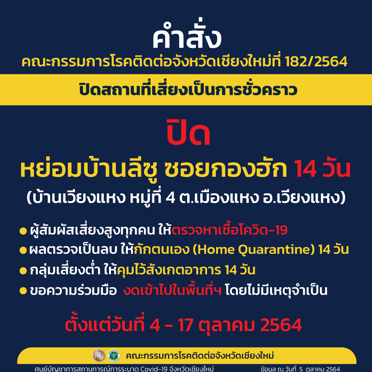คณะกรรมการโรคติดต่อจังหวัดเชียงใหม่ ออกประกาศยกเลิกมาตรการควบคุมการเดินทางของพนักงาน บริษัท แพนดอร่า โพรดักชั่น จำกัด เข้ามาในพื้นที่จังหวัดเชียงใหม่ ตั้งแต่วันที่ 1 ตุลาคม เป็นต้นไป ภายหลังการแพร่ระบาดในบริษัทฯ ดีขึ้นตามลำดับ