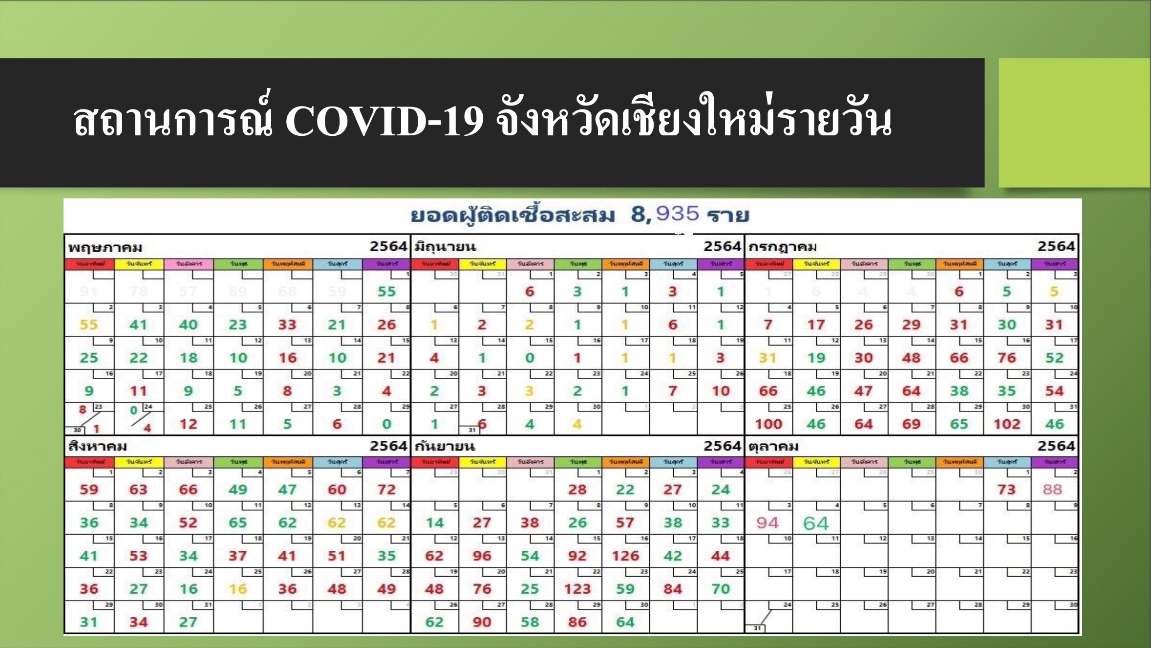 วันนี้ (5 ต.ค. 64) ที่ ห้องประชุม 3 อาคารอำนวยการ ศาลากลางจังหวัดเชียงใหม่ ดร.ทรงยศ คำชัย หัวหน้ากลุ่มงานควบคุมโรคติดต่อ สำนักงานสาธารณสุขจังหวัดเชียงใหม่ เปิดเผยถึงสถานการณ์การแพร่ระบาดโรคโควิด-19 ของจังหวัดเชียงใหม่ ในการแถลงข่าวสื่อมวลชนประจำสัปดาห์ ว่า ยังอยู่ในเกณฑ์ที่สามารถควบคุมได้ เนื่องจากจำนวนผู้ป่วยรายใหม่ต่อวันของจังหวัดเชียงใหม่ยังอยู่ในจำนวนที่ต่ำกว่า 100 ราย ซึ่งอาจจะมีการขยับขึ้นลงบ้าง เนื่องจากตัวเลขของผู้ติดเชื้อที่เพิ่มขึ้นมาจากการตรวจคัดกรองกลุ่มเสี่ยงสูงหลังจากพบคลัสเตอร์ใหม่ หรือ และบางครั้งก็มาจากการตรวจหาเชื้อในกลุ่มเสี่ยงสูงในรอบที่ 2 และ 3 ของการกักตัว ด้านศักยภาพในการรองรับผู้ป่วยในโรงพยาบาลของจังหวัดเชียงใหม่ทั้งโรงพยาบาลรัฐ โรงพยาบาลเอกชน และโรงพยาบาลสนาม ของจังหวัดเชียงใหม่นั้น ก็ยังสามารถรองรับผู้ป่วยได้เพียงพอและไม่เป็นภาระที่หนักเกินไปต่อบุคคลากรทางการแพทย์ที่ต้องดูแลผู้ป่วย