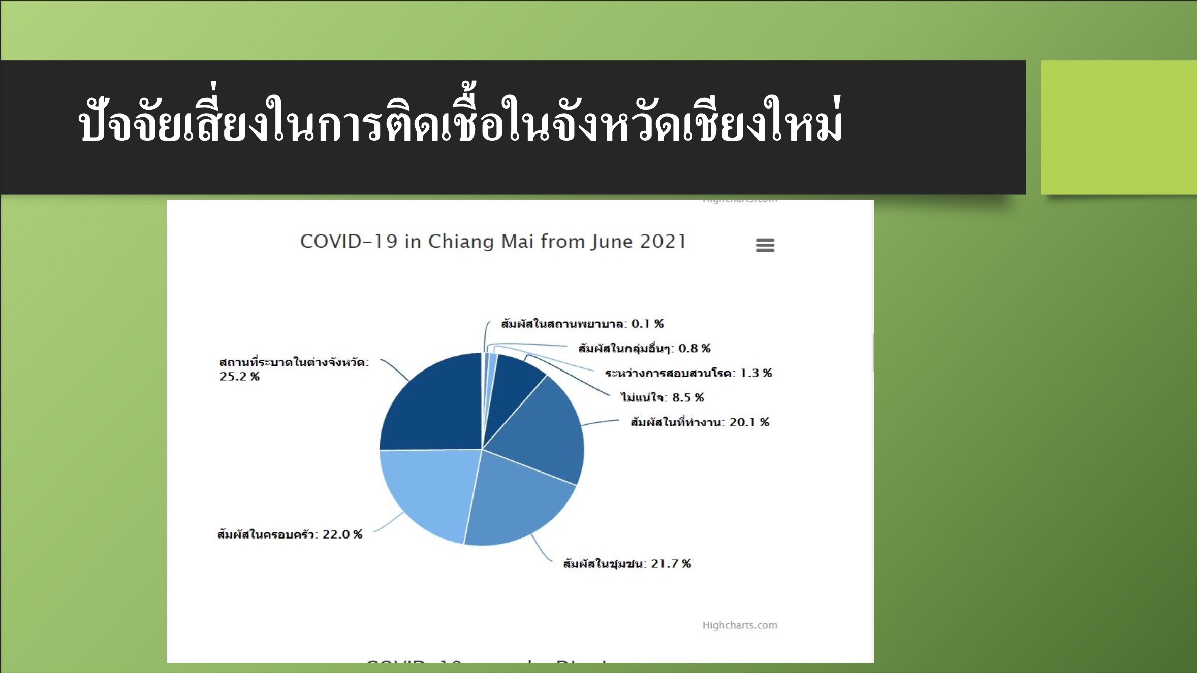 ด้านสาเหตุการติดเชื้อของจังหวัดเชียงใหม่นั้น จากการวิเคราะห์พบว่า ขณะนี้การติดเชื้อจากการนำเข้าจากต่างจังหวัดนั้นมีแนวโน้มเริ่มลดลงแล้ว แต่การติดเชื้อในครอบครัว ในชุมชน และในสถานที่ทำงานกลับมีแนวโน้มเพิ่มขึ้น เนื่องจากมีประวัติเดินทางไปสถานที่เสี่ยงมาและไม่คิดว่าตัวเองเสี่ยง หรือตรวจรอบแรกแล้วไม่พบเชื้อจึงไม่มีการกักตัวอย่างเคร่งครัด จนทำให้เกิดการแพร่ระบาดในครอบครัวและชุมชนตามมา
