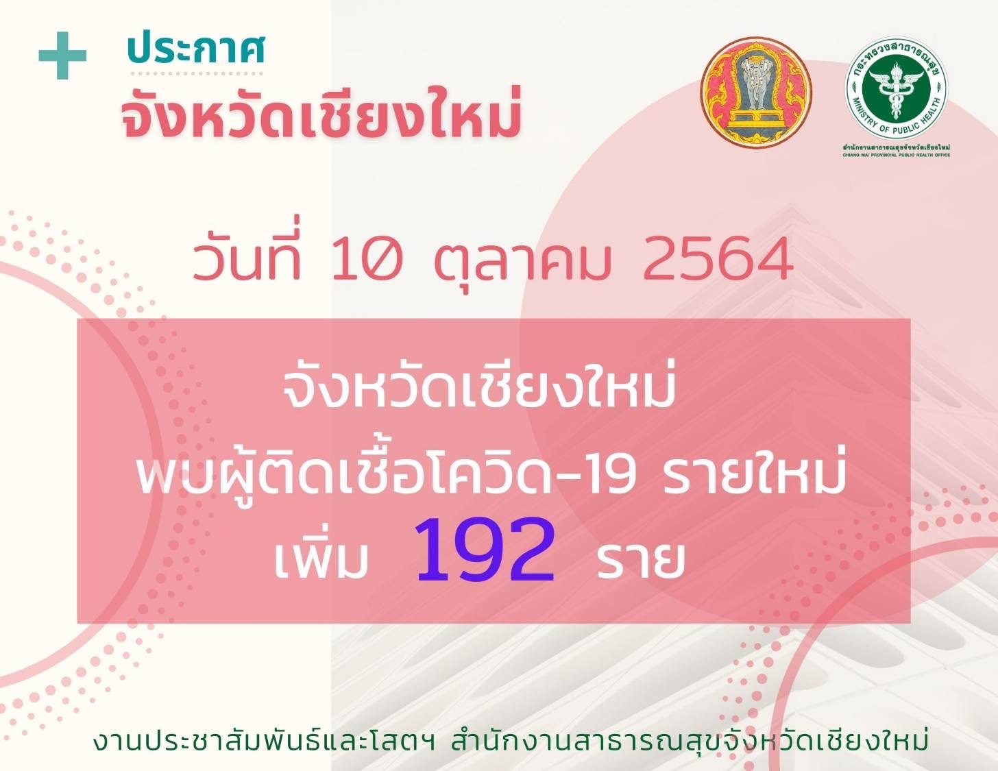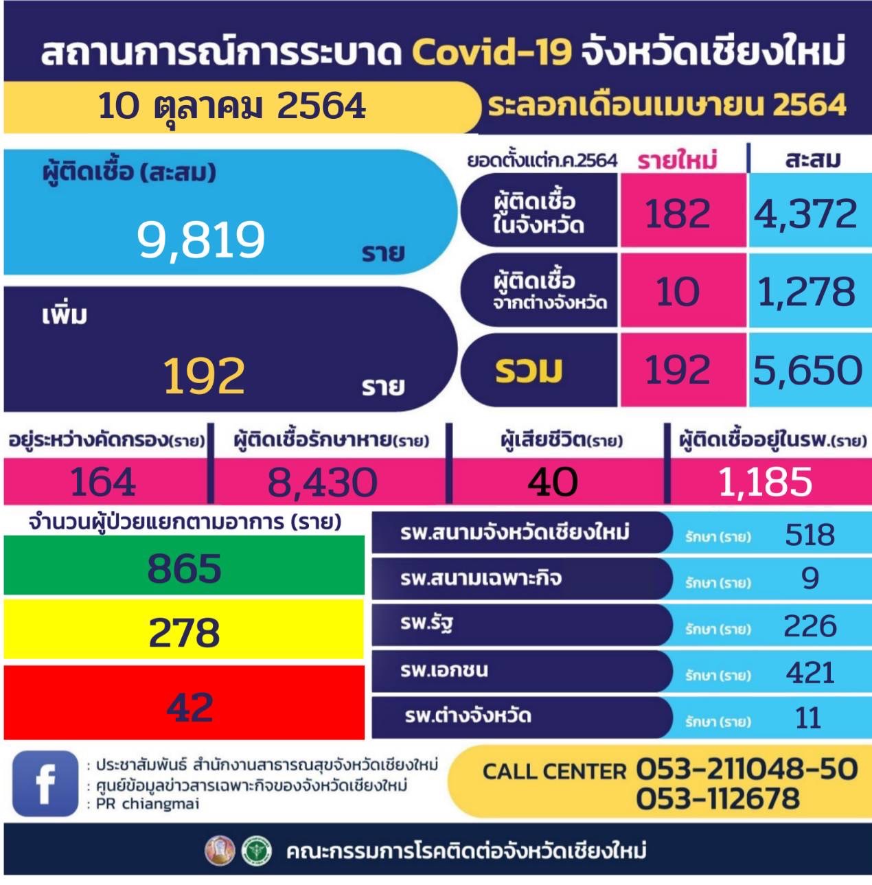 สถานการณ์การแพร่ระบาดโรคโควิด-19 จังหวัดเชียงใหม่ วันนี้ (10 ต.ค. 64) พบผู้ติดเชื้อรายใหม่เพิ่มสูงถึง 192 ราย โดยเป็นผู้ติดเชื้อในจังหวัดถึง 182 ราย อีก 10 รายเป็นผู้ติดเชื้อจากต่างจังหวัด ทำให้ผู้ติดเชื้อสะสมตั้งแต่เดือนกรกฎาคม 2564 อยู่ที่ 5,650 ราย ยังคงรักษาตัวอยู่ในโรงพยาบาลทุกประเภท จำนวน 1,185 ราย แยกเป็นโรงพยาบาลสนามจังหวัดเชียงใหม่ 518 ราย โรงพยาบาลสนามเฉพาะกิจ 9 ราย โรงพยาบาลรัฐ 226 ราย โรงพยาบาลเอกชน 421 ราย และโรงพยาบาลต่างจังหวัด 11 ราย