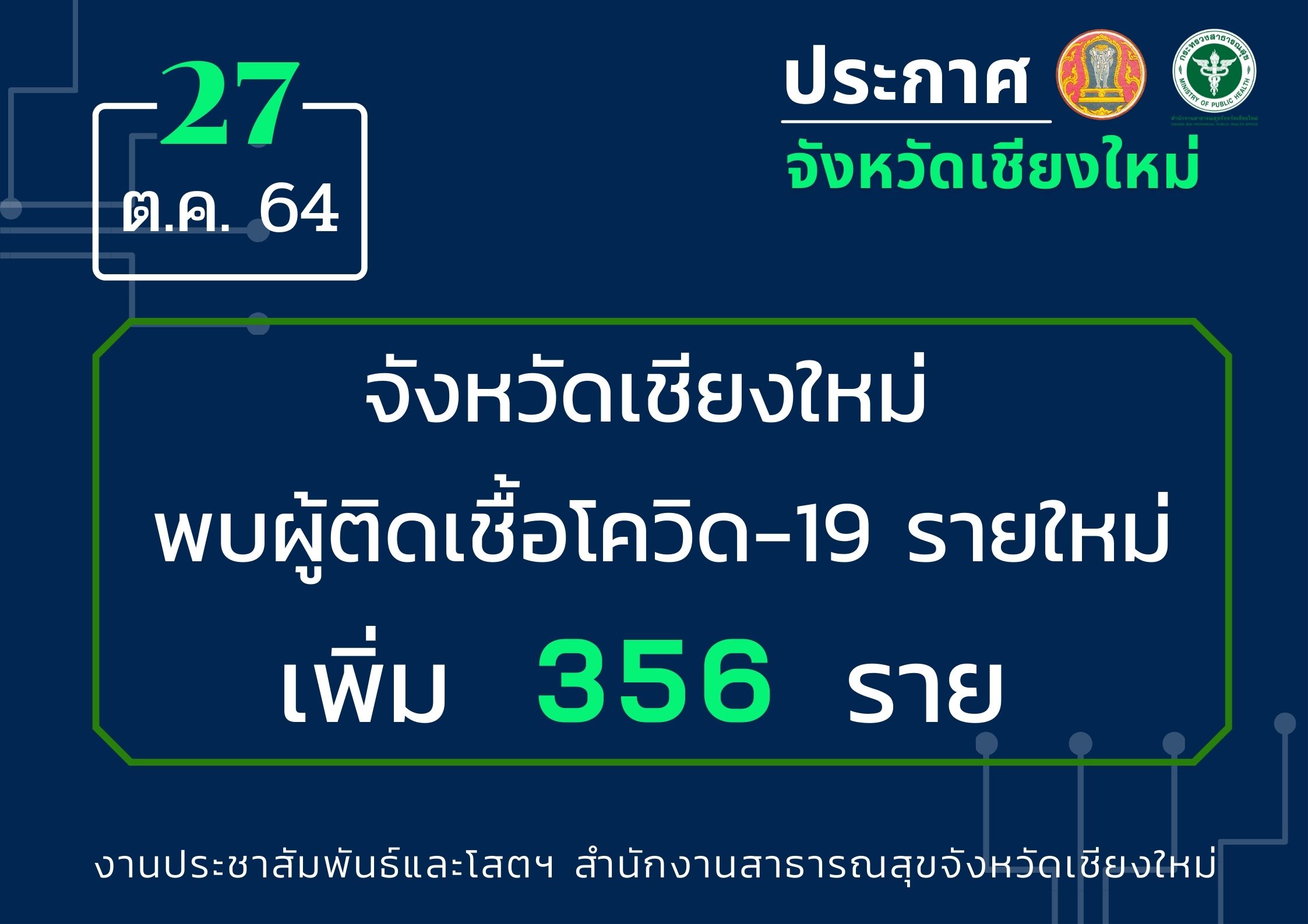 จังหวัดเชียงใหม่ พบผู้ติดเชื้อรายใหม่เพิ่ม 356 ราย ส่วนใหญ่ยังเป็นผู้ติดเชื้อในจังหวัด และผู้ป่วยส่วนมากเป็นผู้ป่วยที่ไม่มีอาการหรือมีอาการเพียงเล็กน้อยเท่านั้น