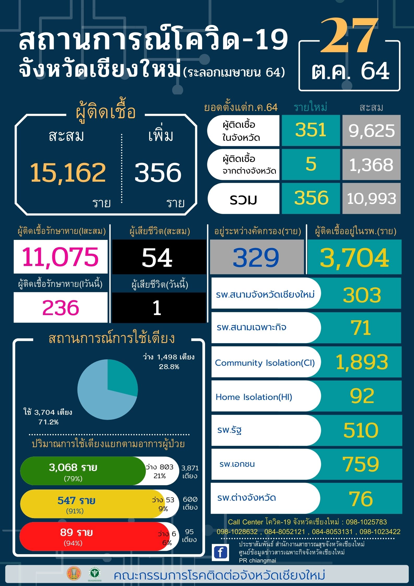 สถานการณ์การแพร่ระบาดโรคโควิด-19 จังหวัดเชียงใหม่ วันนี้ (27 ต.ค. 64) พบผู้ติดเชื้อรายใหม่เพิ่ม 356 ราย โดยเป็นผู้ติดเชื้อในจังหวัดถึง 351 ราย อีก 5 รายเป็นผู้ติดเชื้อจากต่างจังหวัด ทำให้ผู้ติดเชื้อสะสมตั้งแต่เดือนกรกฎาคม 2564 อยู่ที่ 10,993 ราย ยังคงรักษาตัวอยู่ในโรงพยาบาลทุกประเภท จำนวน 3,704 ราย แยกเป็นโรงพยาบาลสนามจังหวัดเชียงใหม่ 303 ราย โรงพยาบาลสนามเฉพาะกิจ 71 ราย Community Isolation (CI) 1,890 ราย Home Isolation (HI) 92 ราย โรงพยาบาลรัฐ 510 ราย โรงพยาบาลเอกชน 759 ราย และโรงพยาบาลต่างจังหวัด 76 ราย