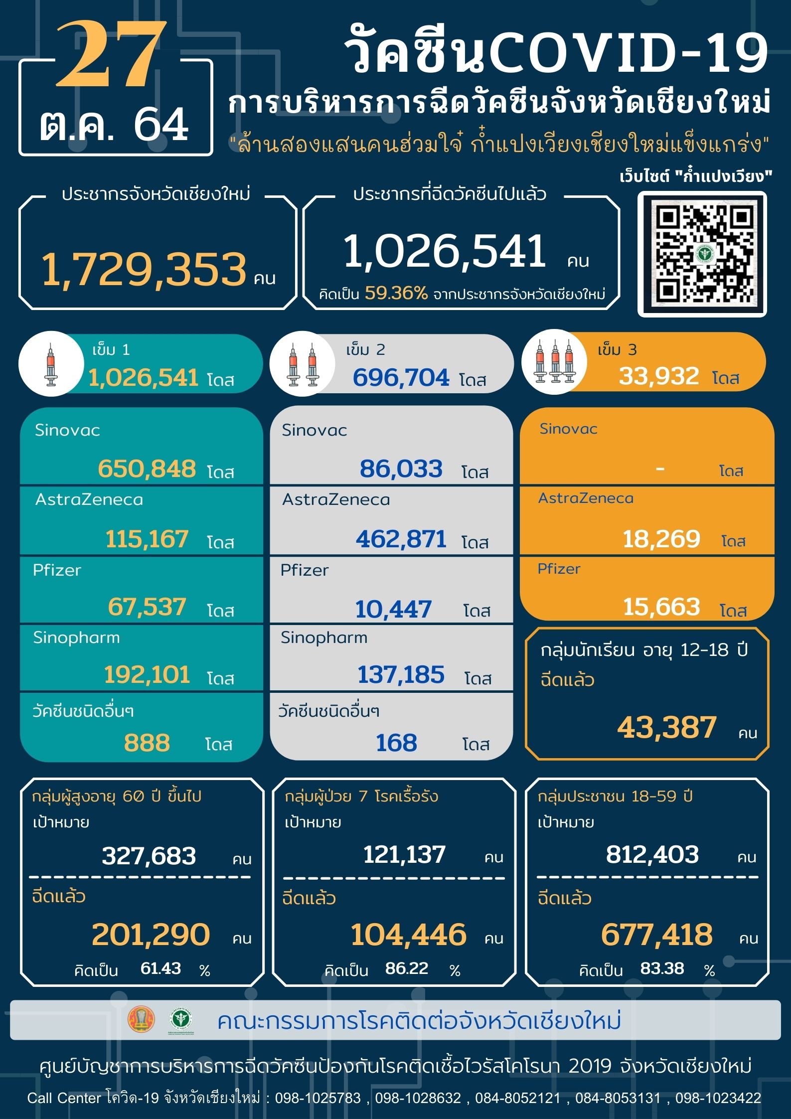 ส่วนการบริหารจัดการวัคซีนจังหวัดเชียงใหม่ ขณะนี้มีผู้ได้รับการฉีดวัคซีนไปแล้ว 1,026,541 คน คิดเป็นร้อยละ 59.36 จากประชากรจังหวัดเชียงใหม่ทั้งหมด 1.7 ล้านคน แบ่งเป็นกลุ่มผู้สูงอายุ 60 ปีขึ้นไป ฉีดแล้ว 201,290 คน คิดเป็นร้อยละ 61.43 กลุ่ม 7 โรคเรื้อรังฉีดแล้ว 104,446 คน คิดเป็นร้อยละ 86.22 และกลุ่มประชาชนทั่วไป ฉีดแล้ว 677,418 คน คิดเป็นร้อยละ 83.38