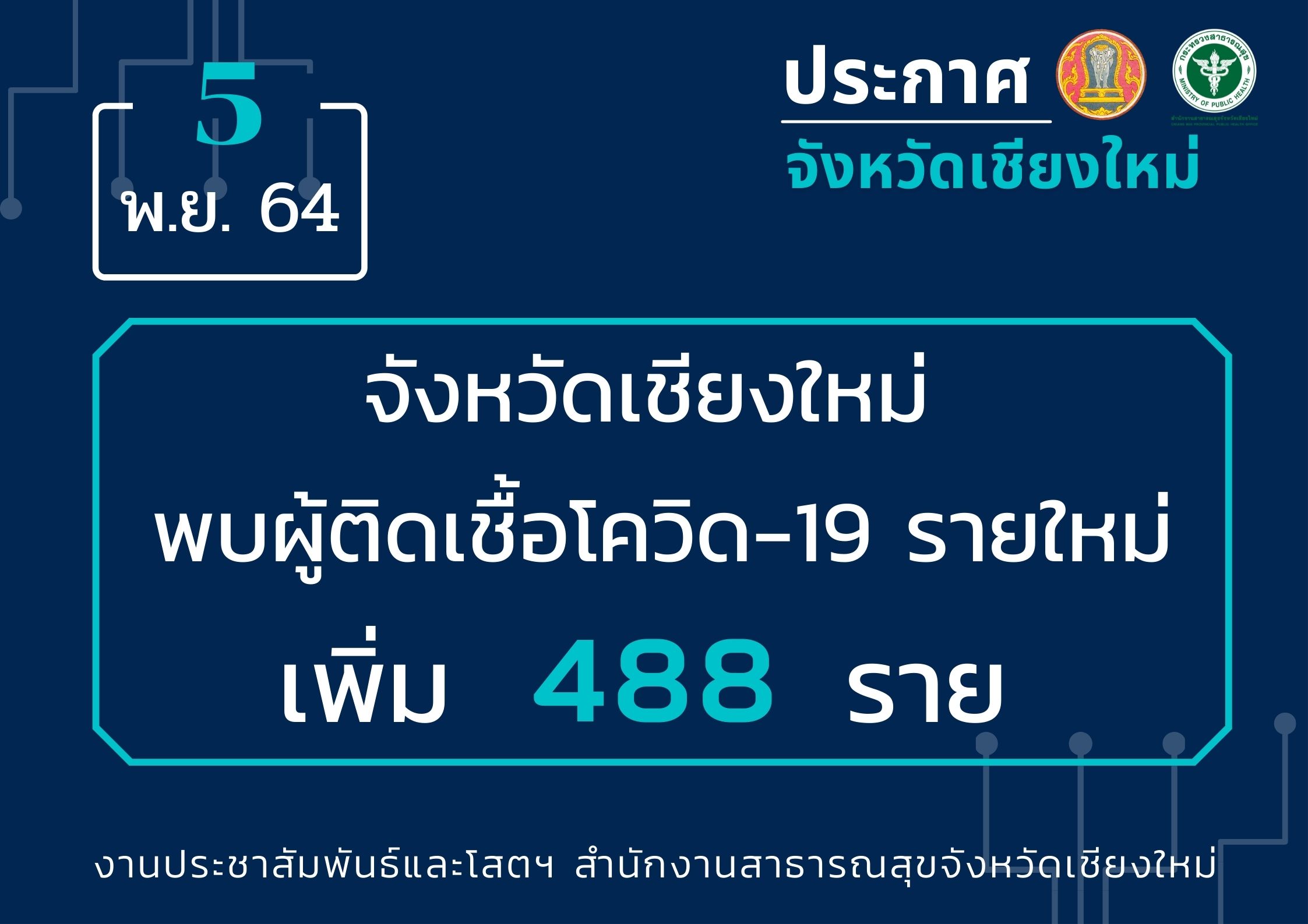 วันนี้ (5 พ.ย. 64) ดร.ทรงยศ คำชัย หัวหน้ากลุ่มงานควบคุมโรคติดต่อจังหวัดเชียงใหม่ เปิดเผยถึงสถานการณ์โควิด-19 ของจังหวัดเชียงใหม่ ในการแถลงข่าวของศูนย์บัญชาการสถานการณ์การระบาดโรคโควิด-19 จังหวัดเชียงใหม่ ว่า ในวันนี้ (5 พ.ย. 64) พบผู้ติดเชื้อรายใหม่จำนวน 488 ราย เป็นผู้ติดเชื้อในจังหวัด 486 ราย ต่างจังหวัด 2 ราย และมีผู้เสียชีวิตเพิ่ม 2 ราย โดยผู้ติดเชื้อที่เพิ่มขึ้นส่วนใหญ่ยังคงมาจากคลัสเตอร์เดิมที่ยังมีการระบาดต่อเนื่อง เป็นการตรวจพบกลุ่มเสี่ยงระหว่างการกักตัว การออกตรวจเชิงรุก และการติดตามผู้สัมผัส เช่น คลัสเตอร์ตลาดเมืองใหม่ 14 ราย ตลาดวโรรส 3 ราย ตลาดสามแยกสันทราย 3 ราย ตลาดต้นลำไย 2 ราย ตลาดประตูเชียงใหม่ ตลาดมีโชคและตลาดธานินทร์ อีกแห่งละ 1 ราย