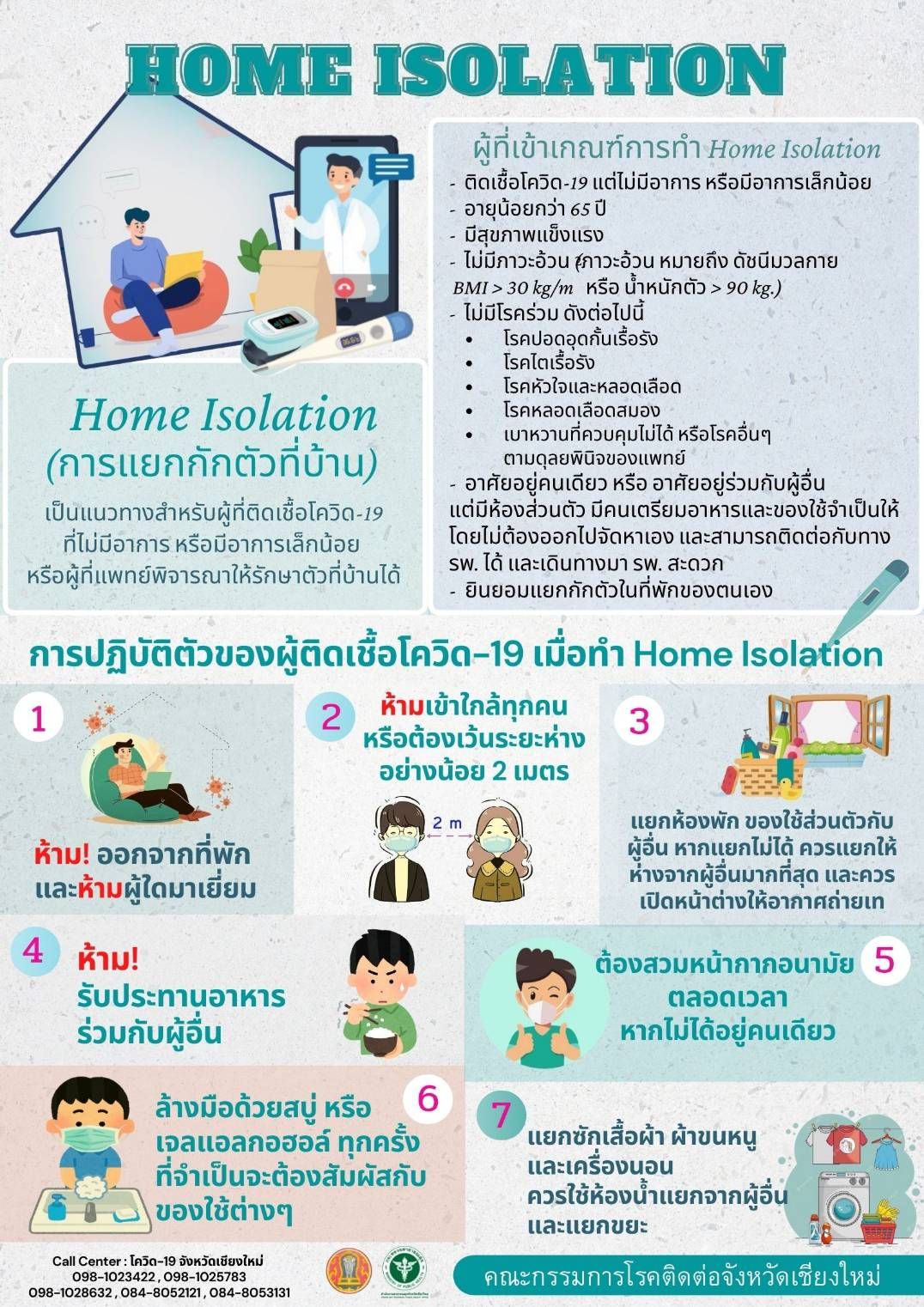 ทั้งนี้ผู้ติดเชื้อที่ทราบผลการตรวจจากโรงพยาบาล หรือชุดตรวจ ATK ด้วยตนเอง ว่าเป็นบวก และต้องการเข้ารับการรักษาด้วยวิธี Home Isolation สามารถติดต่อได้ที่โรงพยาบาลใกล้บ้าน หรือสายด่วน 1330 ต่อ 14 ตลอด 24 ชั่วโมง โดยสามารถสอบถามข้อมูลเพิ่มเติมได้ที่ Call Center โควิด-19 สำนักงานสาธารณสุขจังหวัดเชียงใหม่ หมายเลขโทรศัพท์ 084-805-2121 ,084-805-3131 ทุกวันเวลา 08.30 – 16.30 น.