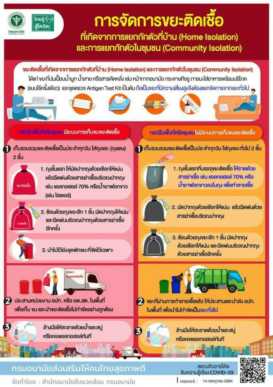 การปฏิบัติตัวของผู้ติดเชื้อโควิด-19 ที่รักษาในระบบ Home Isolation นั้น จะต้องไม่ให้บุคคลอื่นมาเยี่ยมที่บ้านระหว่างแยกกักตัวและงดการออกจากบ้านในระหว่างแยกตัว อยู่ในห้องส่วนตัวตลอดเวลา แยกสิ่งของใช้ส่วนตัวไม่ใช้ร่วมกับผู้อื่น หลีกเลี่ยงการอยู่ใกล้ชิดกับบุคคลอื่นในที่พักอาศัย หากจำเป็นต้องเข้าใกล้ผู้อื่น ต้องสวมหน้ากากอนามัยและอยู่ห่างอย่างน้อย 1 เมตร ส่วนการทำความสะอาดพื้นผิวต่างๆ ควรทำความสะอาดด้วยน้ำและน้ำยาฟอกผ้าขาว เช่น ไฮเตอร์, คลอรอกซ์ ในอัตราน้ำยาฟอกขาว 1 ส่วน ต่อน้ำ 9 ส่วน และการทิ้งหน้ากากอนามัยที่ใช้แล้วหรือขยะที่ปนเปื้อนสารคัดหลั่งให้ใส่ถุงพลาสติก และปิดปากถุงให้สนิทก่อน ทิ้งขยะที่ฝาปิดมิดชิด และทำความสะอาดมือด้วยแอลกอฮอล์ ทันที