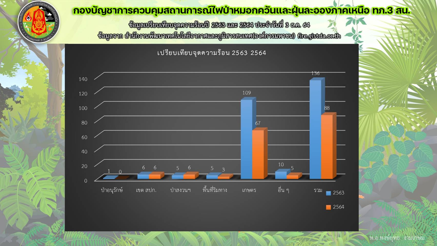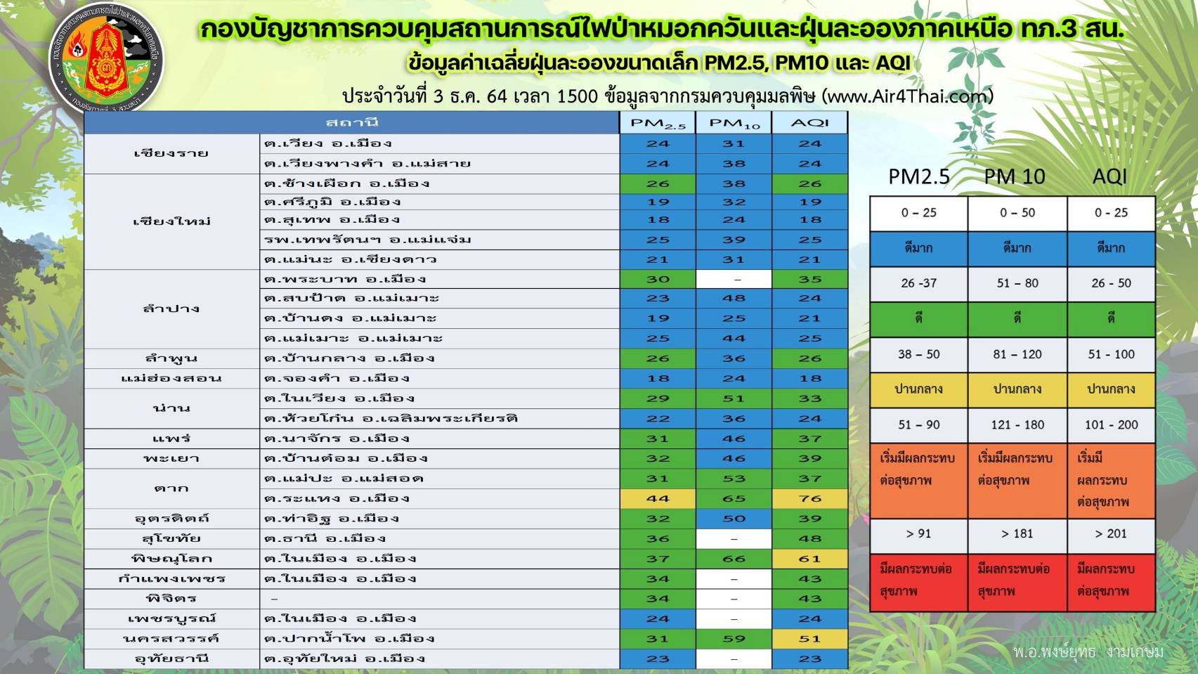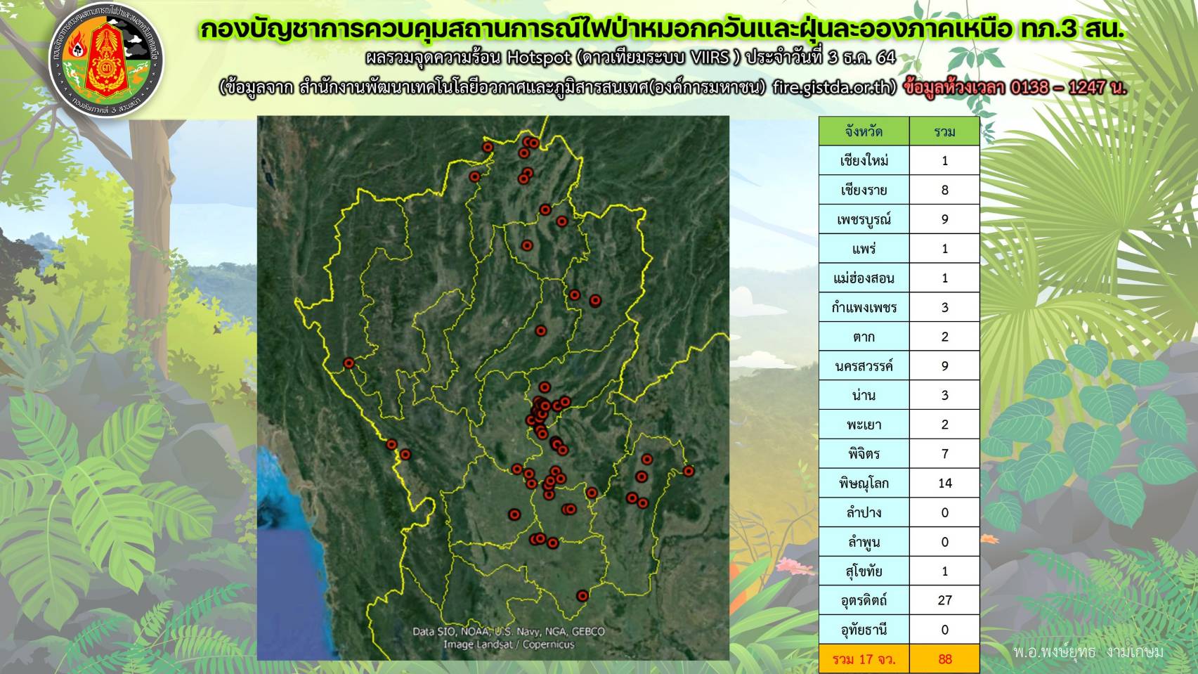 จากการที่กองบัญชาการควบคุมสถานการณ์ไฟป่าหมอกควันและฝุ่นละอองภาคเหนือ กองทัพภาคที่ 3 ส่วนหน้า ติดตามสถานการณ์หมอกควันและฝุ่นละอองในพื้นที่ 17 จังหวัดภาคเหลือ ล่าสุดพบว่า  สภาพอากาศมีค่า PM 2.5 ระหว่าง 17 – 44 มก./ลบ.ม. โดยมีค่าเฉลี่ยมากสุดที่ ต.ระแหง อ.เมือง จว.ต.ก. ,ค่า PM 10 อยู่ระหว่าง 22 – 67 มก./ลบ.ม. โดยมีค่าเฉลี่ยมากสุด ที่ ต.ในเมือง อ.เมือง จว.พ.ล.และ ค่า AQI มีค่าเฉลี่ยระหว่าง 17 – 76 มก./ลบ.ม. โดยมีค่าเฉลี่ยมากสุด ต.ระแหง อ.เมือง จว.ต.ก. นอกจากนี้ยังพบจุดความร้อน จำนวน 88 จุด โดยพบในพื้นที่เกษตร  67   จุด,พื้นที่ป่าสงวน  6   จุด,เขต สปก. 6 จุด, พื้นที่ริมทาง  3 จุด และพื้นที่ชุมชนและอื่นๆ  6 จุด