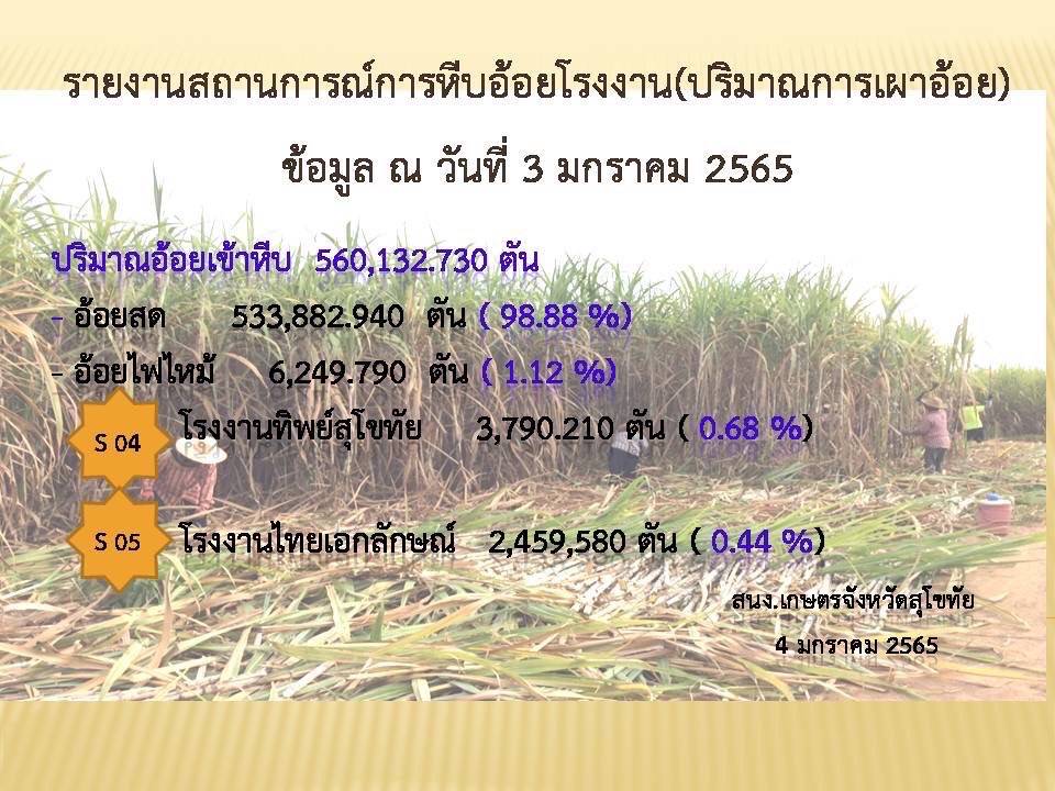 กองอำนวยการรักษาความมั่นคงภายในจังหวัดสุโขทัย เปิดเผยข้อมูลสถานการณ์การหีบอ้อยโรงงานหรือปริมาณการเผาอ้อยวันที่ 3 ม.ค.65 พบว่ามีปริมาณอ้อยเข้าหีบ 533,132.730 ตัน เป็นอ้อยสด 533,882.940 ตัน คิดเป็น 98.88 % อ้อยไฟไหม้ 6,249.790 ตัน คิดเป็น 1.12 % ปัจจุบันสำนักงานเกษตรจังหวัดจัดโครงการรณรงค์ให้เกษตรกรยุคใหม่ร่วมใจหยุดเผา ด้วยการไถกลบทดแทนการเผาเพื่อให้โครงสร้างดินดี เพิ่มอินทรียวัตถุ เพิ่มผลผลิต และผลิตปุ๋ยอินทรีย์เพื่อลดการเผา ที่สำคัญคือการทำการเกษตรปลอดการเผาเพื่อไร้ปัญหาสิ่งแวดล้อมพร้อมเป็นเมืองสีเขียว ซึ่งผู้ใดเผาเศษวัสดุการเกษตรหรือเผาในพื้นที่เกษตรกรรมมีความผิดตามมาตรา 220 วรรคหนึ่ง..ต้องระวางโทษจำคุกไม่เกิน 7 ปี และปรับไม่เกินหนึ่งแสนสี่หมื่นบาท