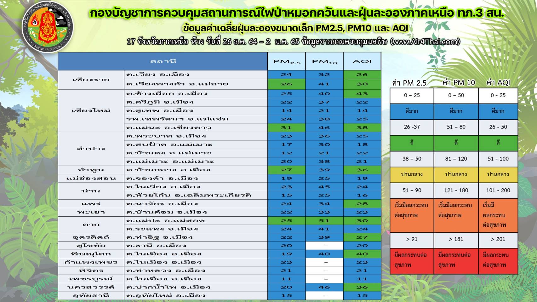 ขณะที่กองบัญชาการควบคุมสถานการณ์ไฟป่าหมอกควันและฝุ่นละอองภาคเหนือ กองทัพภาคที่ 3 ส่วนหน้า ( บก.คฟป.ทภ.3 สน. ) ตรวจสอบภาพอากาศในพื้นที่ 17 จังหวัดภาคเหนือ ห้วงวันที่ 27 ธ.ค.64 – 2 ม.ค.65 พบว่า ภาคเหนือ มีค่าPM 2.5 เฉลี่ยอยู่ระหว่าง 3 – 31 ไมโครกรัมต่อลูกบาศก์เมตร , ค่า PM 10 ระหว่าง 10 – 51 ไมโครกรัมต่อลูกบาศก์เมตร และ ค่า AQI อยู่ระหว่าง 11 – 43 ไมโครกรัมต่อลูกบาศก์เมตร โดยพื้นที่ที่มีค่า PM 10 เฉลี่ยสูงได้แก่ ต.แม่ปะ อ.แม่สอด จังหวัดตาก ทั้งนี้คุณภาพอากาศโดยรวมของภาคเหนืออยู่ในระดับ ดี
