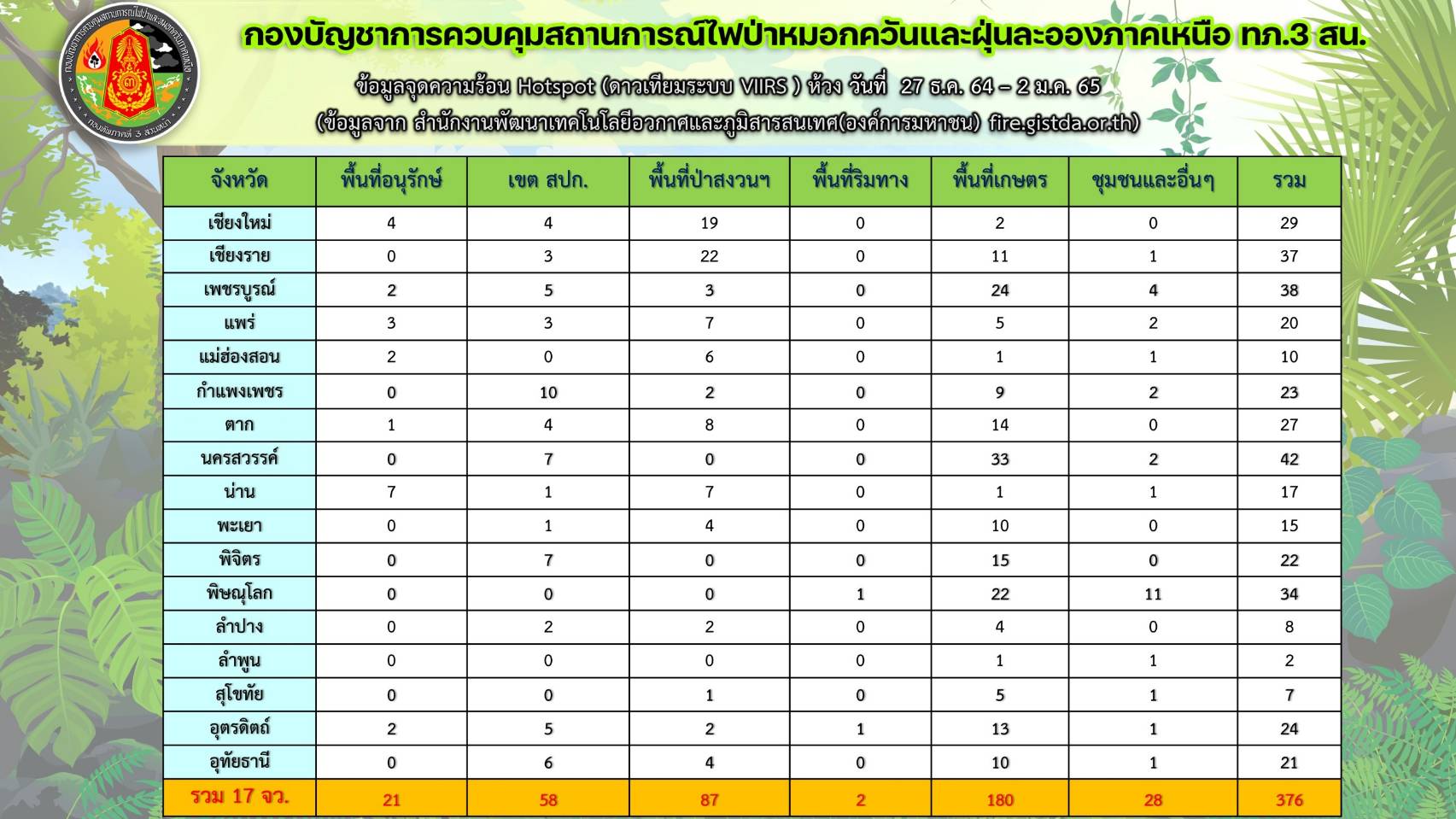 สำหรับจุดความร้อนในพื้นที่ 17 จังหวัดภาคเหนือ (ดาวเทียมระบบ VIIRS) ห้วงวันที่ 27 ธ.ค.64 – 2 ม.ค.65 พบเกิดจุดความร้อนสะสมจำนวน 376 จุด โดยพบพื้นที่เกษตร จำนวน 180 จุด โดยเฉพาะจังหวัดนครสวรรค์ , พื้นที่ป่าสงวน 87 จุด โดยเฉพาะจังหวัดเชียงรายและเขต สปก. จำนวน 58 จุด โดยเฉพาะจังหวัดกำแพงเพชร