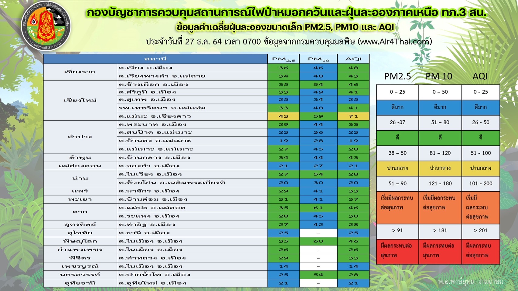 กองบัญชาการควบคุมสถานการณ์ไฟป่าหมอกควันและฝุ่นละอองภาคเหนือ  กองทัพภาคที่ 3 ส่วนหน้า ( บก.คฟป.ทภ.3 สน. ) ตรวจสอบภาพอากาศในพื้นที่ 17 จังหวัดภาคเหนือ ห้วงวันที่ 3- 9 ม.ค.65 พบว่า ภาคเหนือ มีค่าPM 2.5 เฉลี่ยอยู่ระหว่าง 14 – 36  ไมโครกรัมต่อลูกบาศก์เมตร , ค่า PM 10 ระหว่าง 21 – 66  ไมโครกรัมต่อลูกบาศก์เมตร และ ค่า AQI อยู่ระหว่าง 14 – 59  ไมโครกรัมต่อลูกบาศก์เมตร โดยพื้นที่ที่มีค่า PM 2.5 ,PM 10 และ ค่า AQI เฉลี่ยสูงได้แก่ ต.ในเมือง อ.เมือง จังหวัดพิษณุโลก ทั้งนี้คุณภาพอากาศโดยรวมของภาคเหนือยังคงมีสภาพอากาศอยู่ในระดับ ดี