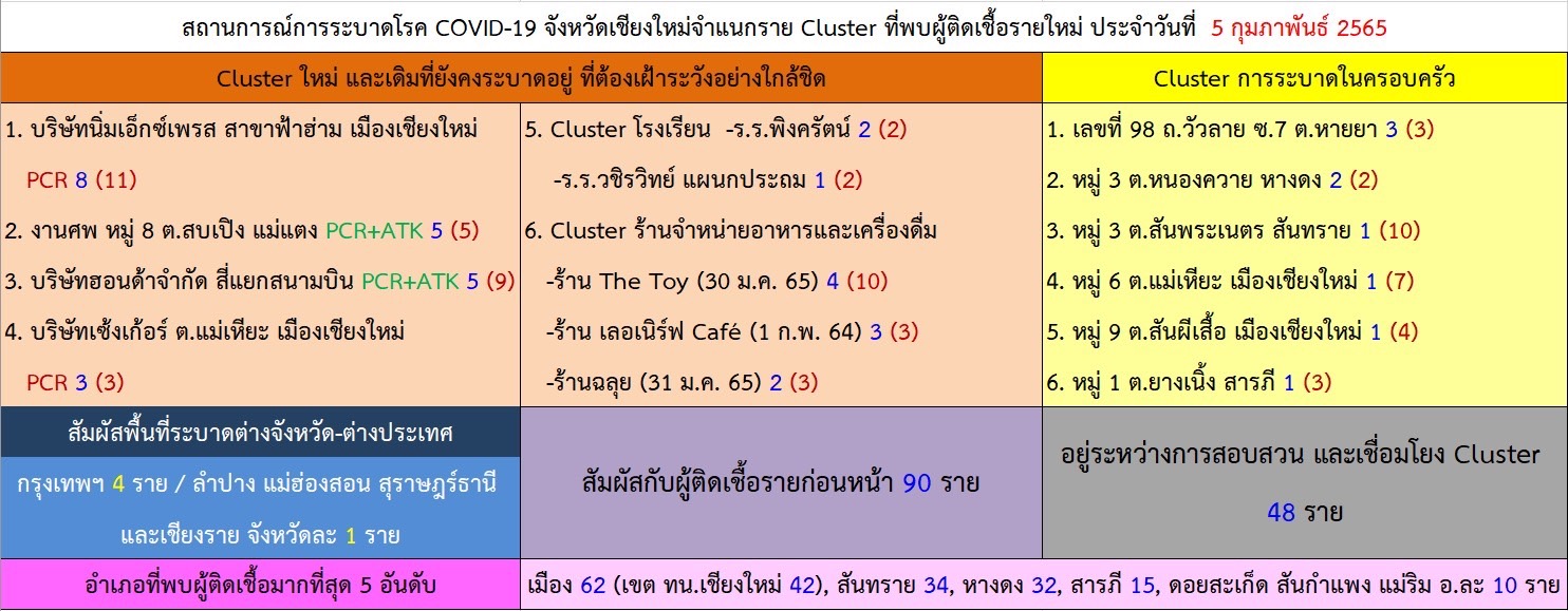 โดยขณะนี้มีคลัสเตอร์ที่ยังต้องเฝ้าระวังอย่างใกล้ชิด ประกอบด้วย 1. คลัสเตอร์บริษัทนิ่มเอ็กซ์เพรส สาขาฟ้าฮ่าม อำเภอเมืองเชียงใหม่ ตรวจ RT-PCR พบรายใหม่ เพิ่ม 8 ราย ยอดรวมทั้งหมด 11 ราย เป็นการสัมผัสในสถานที่ทำงาน 2. คลัสเตอร์งานศพ หมู่ที่ 8 ตำบลสบเปิง อำเภอแม่แตง ตรวจ RT-PCR พบ 4 ราย และตรวจ ATK พบ 1 ราย เป็นการระบาดในชุมชนกลุ่มผู้ไปร่วมงานศพ 3. คลัสเตอร์บริษัท ฮอนด้า จำกัด สาขาสี่แยกสนามบิน ตำบลป่าแดด อำเภอเมืองเชียงใหม่ พบจากการตรวจ RT-PCR 2 ราย ATK 3 ราย เป็นการระบาดในสถานที่ทำงาน 4. คลัสเตอร์บริษัทเซ้งเก้อร์ ตำบลแม่เหียะ อำเภอเมืองเชียงใหม่ เป็นการระบาดในที่ทำงานเช่นเดียวกัน 5. คลัสเตอร์ในโรงเรียน วันนี้พบผู้ติดเชื้อในโรงเรียนกระจายไปหลายโรงเรียน และหลายอำเภอ โดยมีคลัสเตอร์ที่เป็นกลุ่มก้อน 2 โรงเรียน คือ โรงเรียนพิงครัตน์ พบ 2 ราย และโรงเรียนวชิรวิทย์ แผนกประถมศึกษา พบเพิ่ม 1 ราย ยอดรวม 2 ราย ซึ่งเป็นการแพร่ระบาดในกลุ่มนักเรียน อยู่ระหว่างการสอบสวน และควบคุมโรค และ 6. คลัสเตอร์ที่เกี่ยวข้องกับร้านที่อนุญาตให้เปิดจำหน่ายอาหารและเครื่องดื่ม พบผู้ติดเชื้อรายใหม่เป็นทั้งพนักงานร้าน และลูกค้า จำนวน 3 ร้านด้วยกัน ได้แก่ ร้าน The Toy (พบผู้ติดเชื้อที่มีประวัติเข้าไปใช้บริการวันที่ 30 มกราคม 2565) พบเพิ่ม 4 ราย ยอดรวม 10 ราย, ร้านเลอเนิร์ฟ Café (พบผู้ติดเชื้อที่มีประวัติเข้าไปใช้บริการวันที่ 1 กุมภาพันธ์ 2565) พบใหม่ 3 ราย และร้านฉลุย (พบผู้ติดเชื้อที่มีประวัติเข้าไปใช้บริการวันที่ 31 ม.ค. 65) พบเพิ่ม 2 ราย ยอดรวม 3 ราย โดยขณะนี้ทีมควบคุมโรคอำเภอทุกอำเภอที่เกิดคลัสเตอร์ ได้ลงพื้นที่ควบคุม ป้องกันโรค และคัดแยกกลุ่มเสี่ยงสูงเข้าตรวจคัดกรอง และให้กลุ่มเสี่ยงต่ำสังเกตอาการเรียบร้อยแล้ว