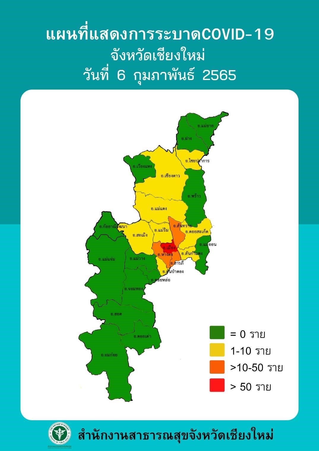 สถานการณ์การแพร่ระบาดโรคโควิด-19 จังหวัดเชียงใหม่ วันนี้ (6 ก.พ. 65) พบผู้ติดเชื้อรายใหม่เพิ่ม 194 ราย โดยเป็นผู้ติดเชื้อจากต่างจังหวัด 8 ราย ได้แก่ กรุงเทพมหานคร 4 ราย ลำปาง แม่ฮ่องสอน สุราษฎร์ธานี และเชียงราย จังหวัดละ 1 ราย ส่วนอีก 186 ราย เป็นผู้ติดเชื้อในจังหวัด