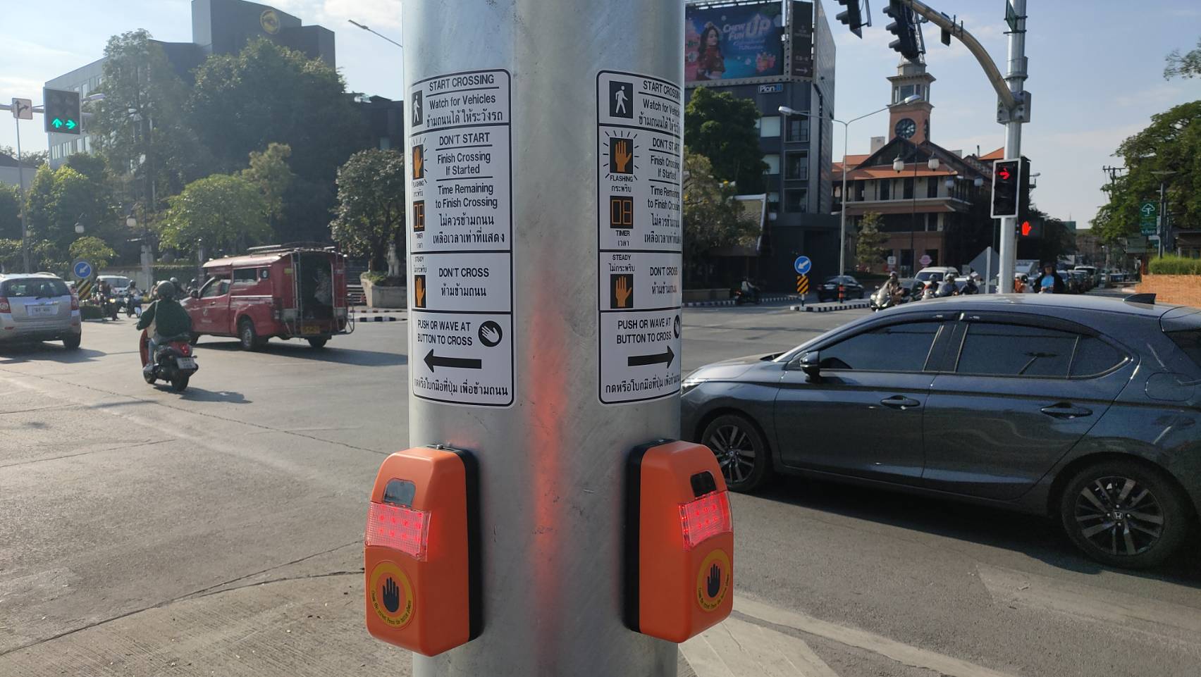 และยานพาหนะ ในส่วนของทางข้าม หรือทางม้าลายบนสี่แยกรินคำนั้น มีระบบการทำงานสัมพันธ์กับระบบควบคุมสัญญาณไฟจราจร ซึ่งจะมีสัญญาณบอกตือนผู้ข้าม และมีตัวเลขระบเวลาในการข้ามถนน นอกจากนี้ยังมีการนำระบบไร้การสัมผัสแทนการกดปุ่มเมื่อต้องการข้ามถนน ซึ่งเป็นการลดความเสี่ยงของการแพร่ระบาดของโรคติดเชื้อไวรัส COVID-19 อีกด้วย