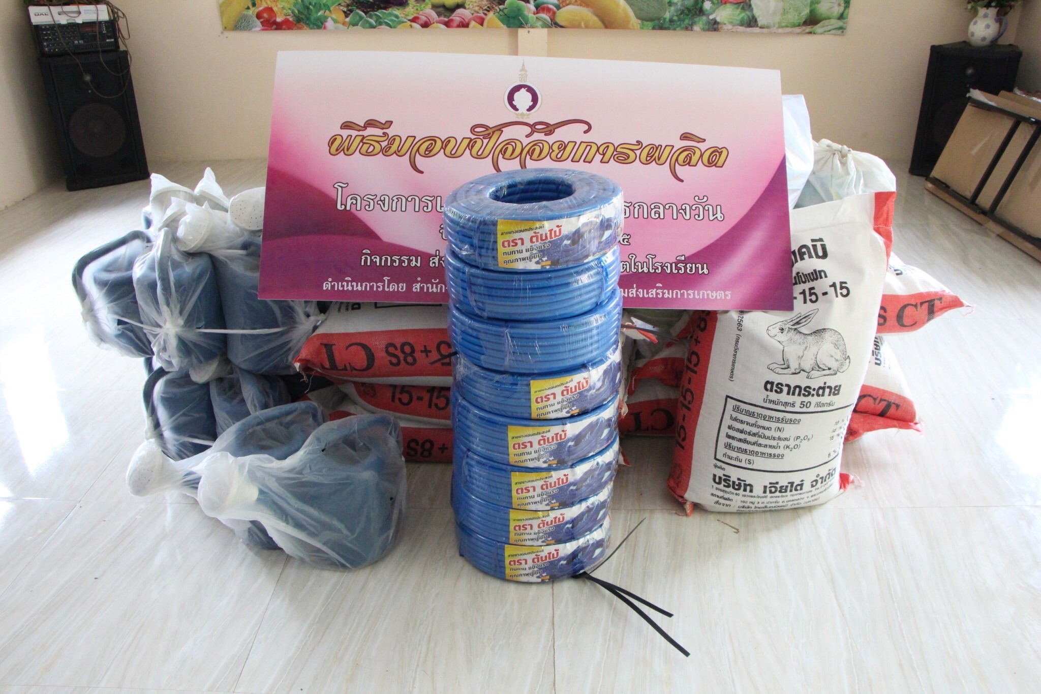 วันที่ 8 กรกฎาคม2565 นายเจริญ พิมพ์ขาล เกษตรจังหวัดเชียงใหม่ พร้อมนายกฤษนันท์ ทองทิพย์ นักวิชาการส่งเสริมการเกษตรชำนาญการ มอบปัจจัยการผลิตโครงการเกษตรเพื่ออาหารกลางวัน ให้กับโรงเรียนตชด. 5 โรงเรียน โรงเรียน กศน.36 โรงเรียน โรงเรียนสพฐ. 2 โรงเรียน รวม 43 โรงเรียน โดยนายนิวัตน์ นะที เกษตรอำเภอแม่แจ่ม พร้อมคณะครู เป็นผู้แทนรับมอบ โดยปัจจัยการผลิต เพื่อใช้ในกิจกรรมส่งเสริมการจัดทำแปลงผลิตพืชในโรงเรียน อาทิ เมล็ดพันธุ์ ผัก, บัวรดน้ำ, ชุดสายยาง ,กรรไกรตัดแต่งกิ่ง, กับดักกาวเหลือง, ปุ๋ยคอก, ปุ๋ยเคมี ทั้งนี้เป็นวัสดุการเกษตร เพื่อให้นักเรียนเรียนรู้ร่วมกัน เกิดกระบวนการกลุ่มในโรงเรียนเกี่ยวกับความรู้ทักษะการประกอบอาชีพการเกษตร แก่นักเรียนและคนในชุมชน อีกทั้งนักเรียนยังได้บริโภคอาหารกลางวันครบตามหลักโภชนาการ ปลอดภัยจากสารพิษ และสามารถนำความรู้ที่ได้รับไปประกอบอาชีพได้อีกด้วย