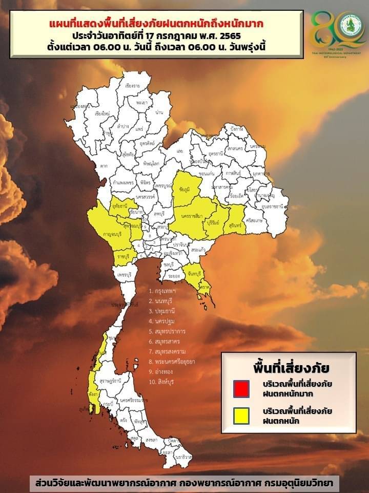 ศูนย์อุตุนิยมวิทยารายงานสภาพอากาศวันนี้พบว่า มรสุมตะวันตกเฉียงใต้กำลังปานกลางพัดปกคลุมทะเลอันดามัน ประเทศไทย และอ่าวไทย ประกอบกับลมใต้พัดปกคลุมภาคเหนือและภาคตะวันออกเฉียงเหนือ ลักษณะเช่นนี้ทำให้ประเทศไทยยังคงมีฝนฟ้าคะนองกับมีฝนตกหนักบางแห่งบริเวณภาคตะวันออกเฉียงเหนือ ภาคกลาง ภาคตะวันออก และภาคใต้ฝั่งตะวันตก ขอให้ประชาชนในบริเวณดังกล่าวระวังอันตรายจากฝนตกหนักและฝนที่ตกสะสม ซึ่งอาจทำให้เกิดน้ำท่วมฉับพลันและน้ำป่าไหลหลากไว้ด้วย