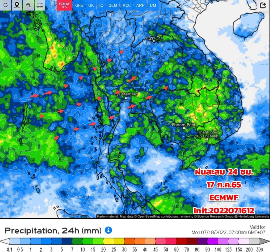 ส่วนในช่วงวันที่ 20 – 23 ก.ค. 65 มรสุมตะวันตกเฉียงใต้ที่พัดปกคลุมทะเลอันดามัน ประเทศไทย และอ่าวไทยจะมีกำลังแรงขึ้น ทำให้ประเทศไทยมีฝนเพิ่มขึ้น และมีฝนตกหนักบางแห่งบริเวณภาคเหนือ ภาคตะวันออกเฉียงเหนือ ภาคกลางรวมทั้งกรุงเทพมหานครและปริมณฑล ภาคตะวันออก และภาคใต้ฝั่งตะวันตก สำหรับคลื่นลมบริเวณทะเลอันดามันและอ่าวไทยจะมีกำลังแรงขึ้น โดยบริเวณทะเลอันดามันตอนบนมีคลื่นสูงประมาณ 2 เมตร บริเวณที่มีฝนฟ้าคะนองมีคลื่นสูงมากกว่า 2 เมตร บริเวณอ่าวไทยตอนบนมีคลื่นสูง 1-2 เมตร ห่างฝั่งคลื่นสูงประมาณ 2 เมตร