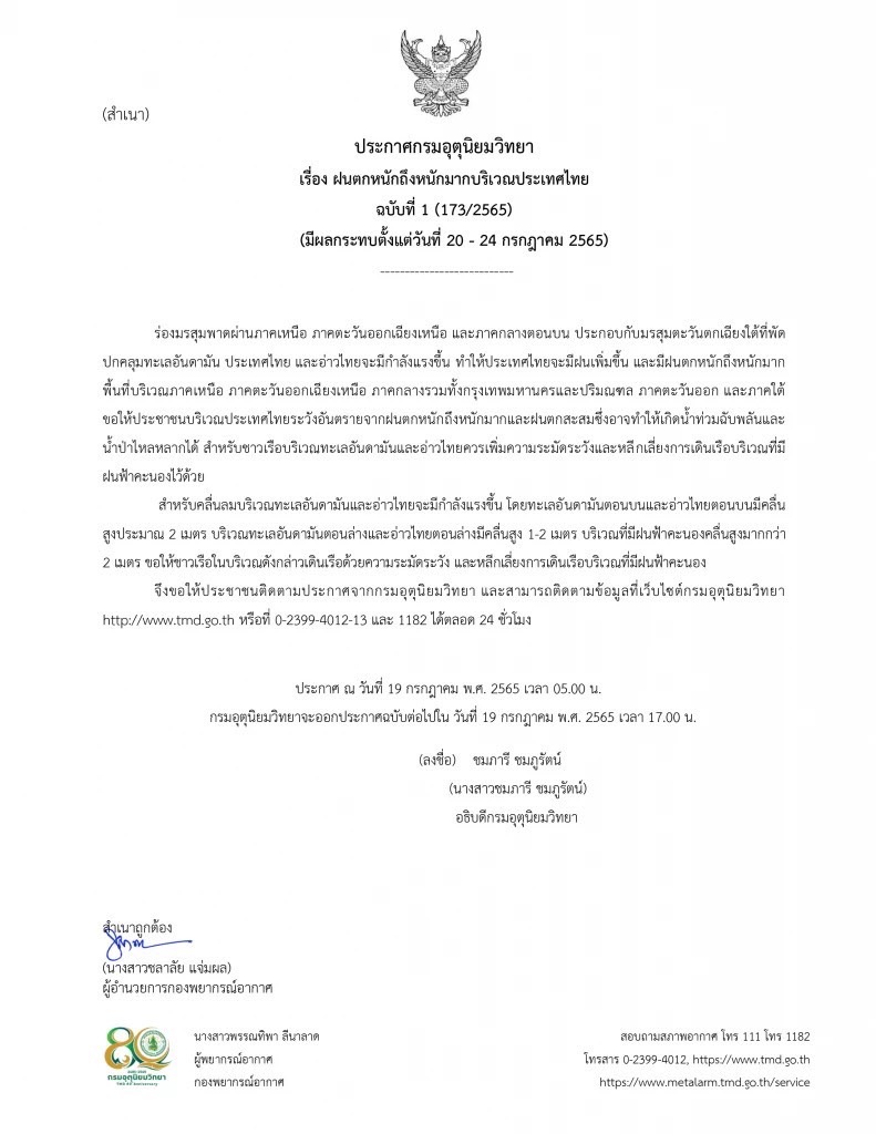 วันนี้ (20 ก.ค. 65) กองอำนวยการป้องกันและบรรเทาสาธารณภัยกลาง (กอปภ.ก.) โดยกรมป้องกันและบรรเทาสาธารณภัย ได้ติดตามสภาวะอากาศจากกรมอุตุนิยมวิทยา พบว่า มีร่องมรสุมพาดผ่านภาคเหนือ ประกอบกับลมมรสุมตะวันตกเฉียงใต้ที่พัดปกคลุมทะเลอันดามัน ประเทศไทย และอ่าวไทยจะมีกำลังแรงขึ้น ทำให้ประเทศไทยมีฝนตกเพิ่มขึ้นและมีฝนตกหนักถึงหนักมากบางพื้นที่บริเวณภาคเหนือ ขณะที่กองอำนวยการน้ำแห่งชาติได้ประเมินสถานการณ์น้ำ พบว่า จะมีปริมาณฝนตกสะสมต่อเนื่อง ประกอบกับลำน้ำและแหล่งน้ำธรรมชาติในพื้นที่ที่มีฝนตกหนัก ปริมาณน้ำในอยู่ในเกณฑ์มาก อาจส่งผลให้เกิดสถานการณ์น้ำท่วมฉับพลัน น้ำป่าไหลหลาก และน้ำท่วมขัง โดยให้ติดตามเฝ้าระวังสถานการณ์ ในช่วงระหว่างวันที่ 20 -24 กรกฎาคม 2565 นี้