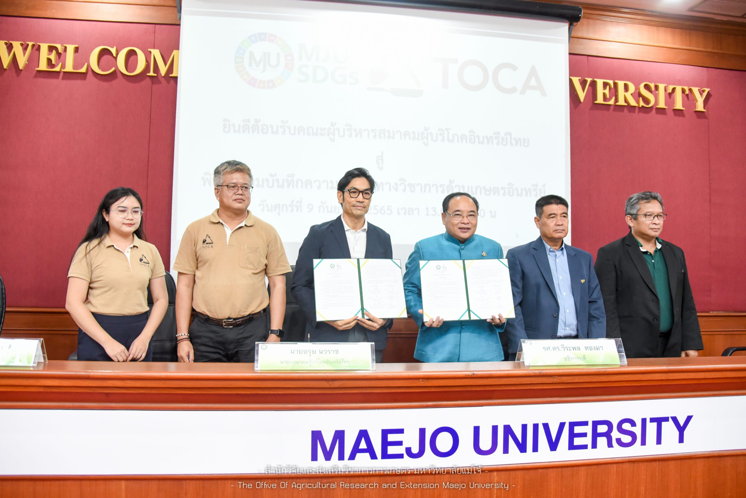 และในวันเดียวกันนี้ ได้มีการจัดพิธีลงนามบันทึกความเข้าใจความร่วมมือทางวิชาการด้านเกษตรอินทรีย์ ระหว่าง มหาวิทยาลัยแม่โจ้ (สำนักวิจัยและส่งเสริมวิชาการการเกษตร) กับ สมาคมผู้บริโภคอินทรีย์ไทย โดยมี รองศาสตราจารย์ ดร.วีระพล ทองมา อธิการบดีมหาวิทยาลัยแม่โจ้ และ นายอรุษ นวราช นายกสมาคมผู้บริโภคอินทรีย์ไทย เป็นผู้แทนลงนามของทั้งสองฝ่าย ทั้งนี้ คณะผู้บริหารของแต่ละฝ่ายร่วมเป็นสักขีพยาน ซึ่งการลงนามความร่วมมือครั้งนี้ เพื่อสร้างความร่วมมือด้านเกษตรอินทรีย์ในการประสานการทำงานที่มีเป้าหมายและเป็นไปในทิศทางเดียวกัน สร้างเครือข่ายและบูรณาการขับเคลื่อนพัฒนาด้านเกษตรอินทรีย์ระหว่างภาครัฐและภาคเอกชน ส่งเสริมและสนับสนุนการวิจัยและพัฒนาการเรียนการสอนด้านเกษตรอินทรีย์และวัตถุดิบจาก จากผลผลิตทางการเกษตรในระบบปลอดภัยและเกษตรอินทรีย์ สร้างและเผยแพร่องค์ความรู้พร้อมทั้งจัดกิจกรรมฝึกอบรมและการศึกษาดูงานด้านเกษตรอินทรีย์ โดยมีกำหนดระยะเวลา 5 ปี