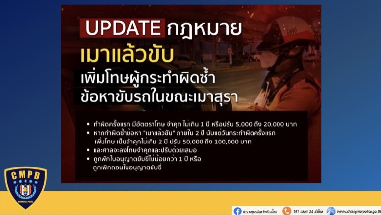 โดยกลุ่มงานจราจร ตำรวจภูธรจังหวัดเชียงใหม่ ได้แจ้งรายละเอียดมาตรการและการบังคับใช้กฎหมาย ดังนี้ เพิ่มโทษผู้ขับขี่ที่กระทำความผิดซ้ำกรณีเมาแล้วขับ โดยการกระทำผิดครั้งแรกจะมีอัตราโทษจำคุกไม่เกิน 1 ปี หรือปรับตั้งแต่ 5,000 – 20,000 บาท หรือทั้งจำทั้งปรับ และหากกระทำผิดซ้ำภายใน 2 ปี นับแต่วันที่กระทำผิดครั้งแรก เพิ่มโทษจำคุกไม่เกิน 2 ปี ปรับไม่เกิน 50,000-100,000 หรือถูกเพิกถอนใบอนุญาตขับขี่ การเพิ่มอัตราโทษที่เป็นปัจจัยต่อการเกิดอุบัติเหตุ เป็นปัจจัยเสี่ยงในการสูญเสียของผู้ขับขี่และผู้ใช้ทาง อาทิ การขับรถเร็วเกินกำหนด จากเดิมปรับไม่เกิน 1,000 บาท เพิ่มเป็นปรับไม่เกิน 4,000 บาท การเพิ่มโทษผู้ขับขี่ที่ขับรถโดยไม่คำนึงถึงความปลอดภัยในชีวิต หรือร่างกายของผู้อื่น อัตราโทษเดิมจำคุกไม่เกิน 3 เดือน ปรับตั้งแต่ 2,000 – 10,000 บาท เพิ่มเป็น จำคุกไม่เกิน 1 ปี ปรับตั้งแต่ 5,000 – 20,000 บาท หรือทั้งจำทั้งปรับ