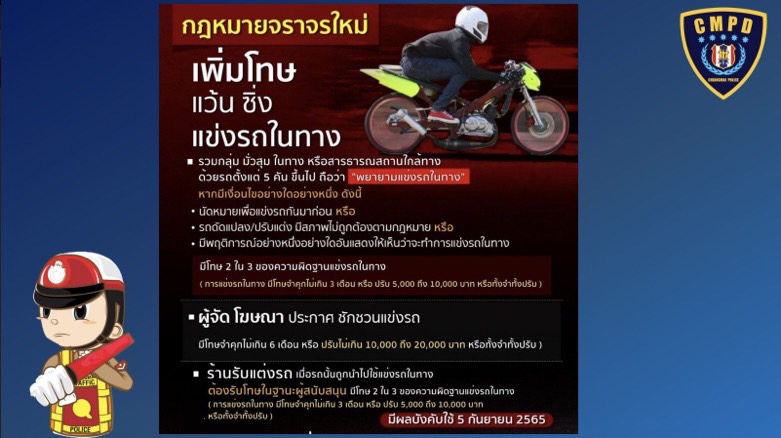 นอกจากนี้ ยังมีการกำหนดความผิดเกี่ยวกับการแข่งรถเพิ่มเติม คือ ผู้ที่รวมกลุ่มหรือมั่วสุมในทาง มีรถตั้งแต่ 5 คันขึ้นไป โดยมีการนัดหมายเพื่อแข่งรถกันมาก่อน และรวมกลุ่มดัดแปลง-ปรับแต่งรถให้มีสภาพไม่ถูกต้องตามกฎหมาย การเพิ่มโทษสำหรับผู้จัด ชักชวน ให้มีการแข่งรถ และการกำหนดโทษใหม่สำหรับร้านรับแต่งรถ เมื่อรถนั้นถูกนำไปใช้แข่งรถในทาง