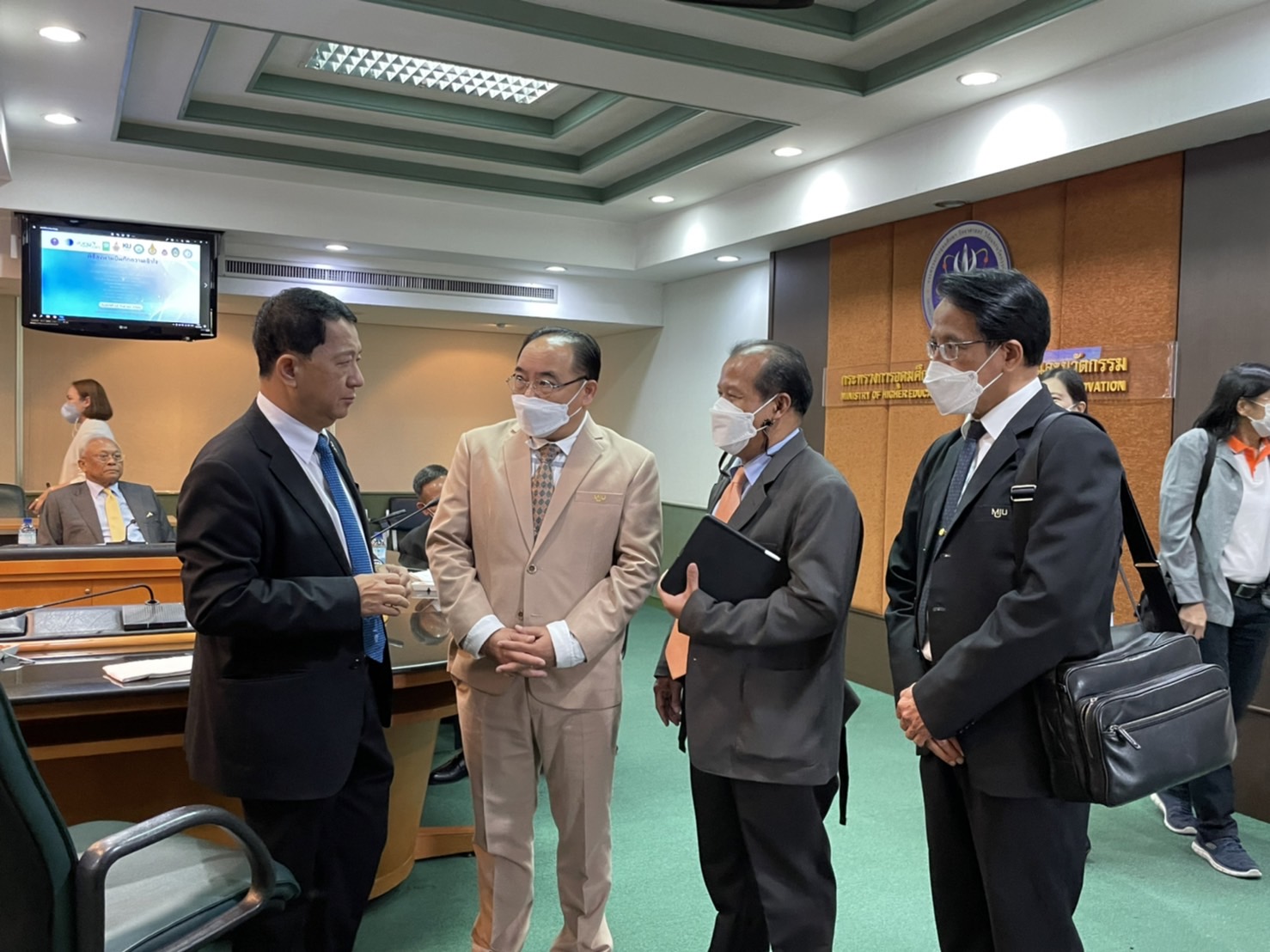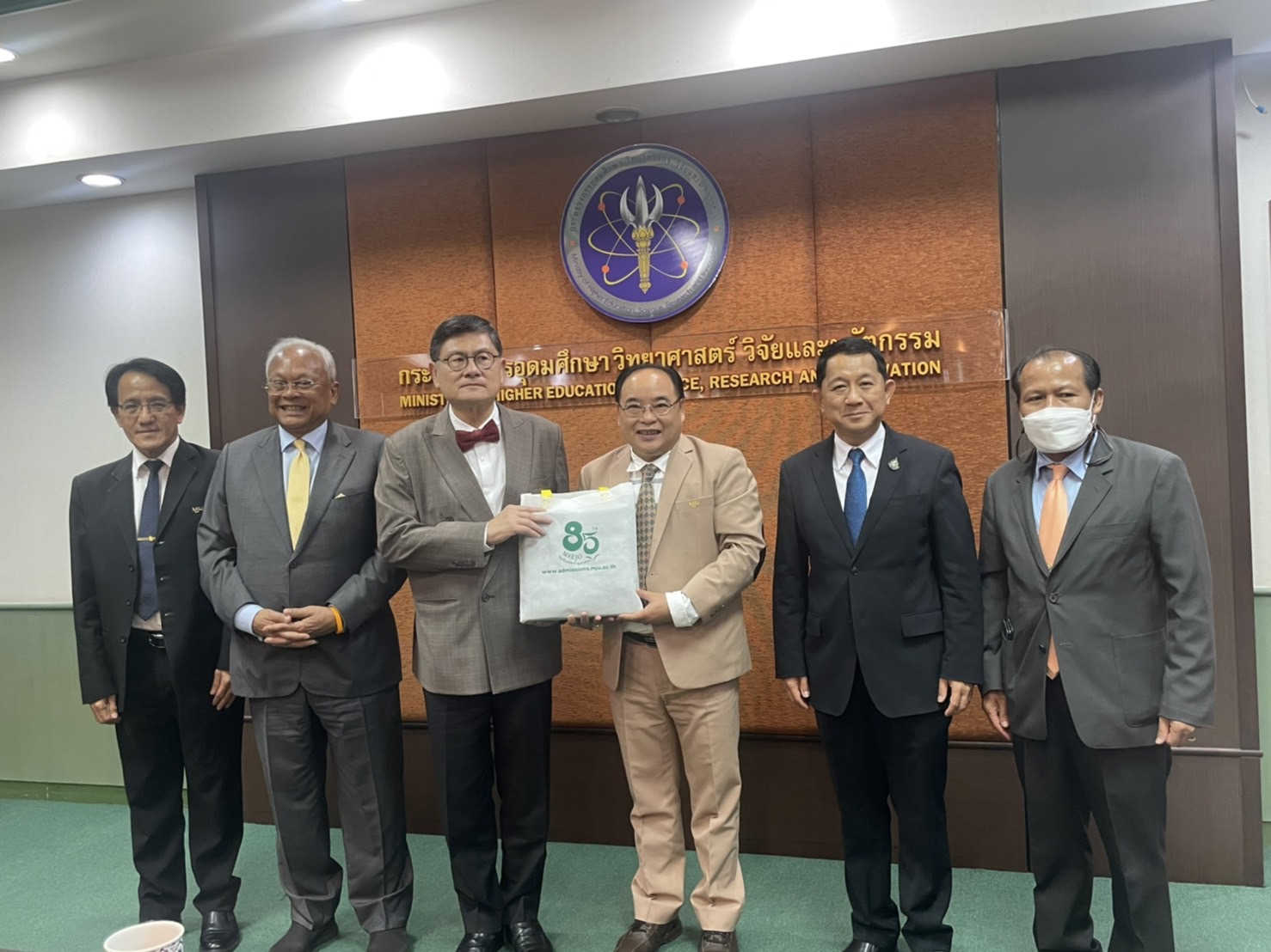 รศ.ดร.วีระพล ทองมา อธิการบดีมหาวิทยาลัยโจ้ รองศาสตราจารย์ ดร.เกรียงศักดิ์ ศรีเงินยวง รองอธิการบดี ผศ.ดร.ณัฐวุฒิ ดุษฎี รองอธิการบดี เข้าร่วมพิธีลงนามบันทึกความเข้าใจสถาบันวิจัยวิทยาศาสตร์และเทคโนโลยีแห่งประเทศไทย (วว.) ร่วมกับ สำนักงานพัฒนาวิทยาศาสตร์และเทคโนโลยีแห่งชาติ(สวทช.) สำนักงานการวิจัยแห่งชาติ (วช.) มหาวิทยาลัยเทคโนโลยีราชมงคล 9 แห่ง มหาวิทยาลัยเกษตรศาสตร์ มหาวิทยาลัยแม่โจ้ มหาวิทยาลัยสงขลานครินทร์ มหาวิทยาลัยวลัยลักษณ์ มหาวิทยาลัยราชภัฏสุราษฎร์ธานี และวิทยาลัยอาชีวศึกษาภาวนาโพธิคุณ โดยมี ศาสตราจารย์พิเศษ ดร.เอนก เหล่าธรรมทัศน์ รัฐมนตรีว่าการอุดมศึกษา วิทยาศาสตร์ วิจัยและนวัตกรรม (อว.) เป็นประธานในพิธี