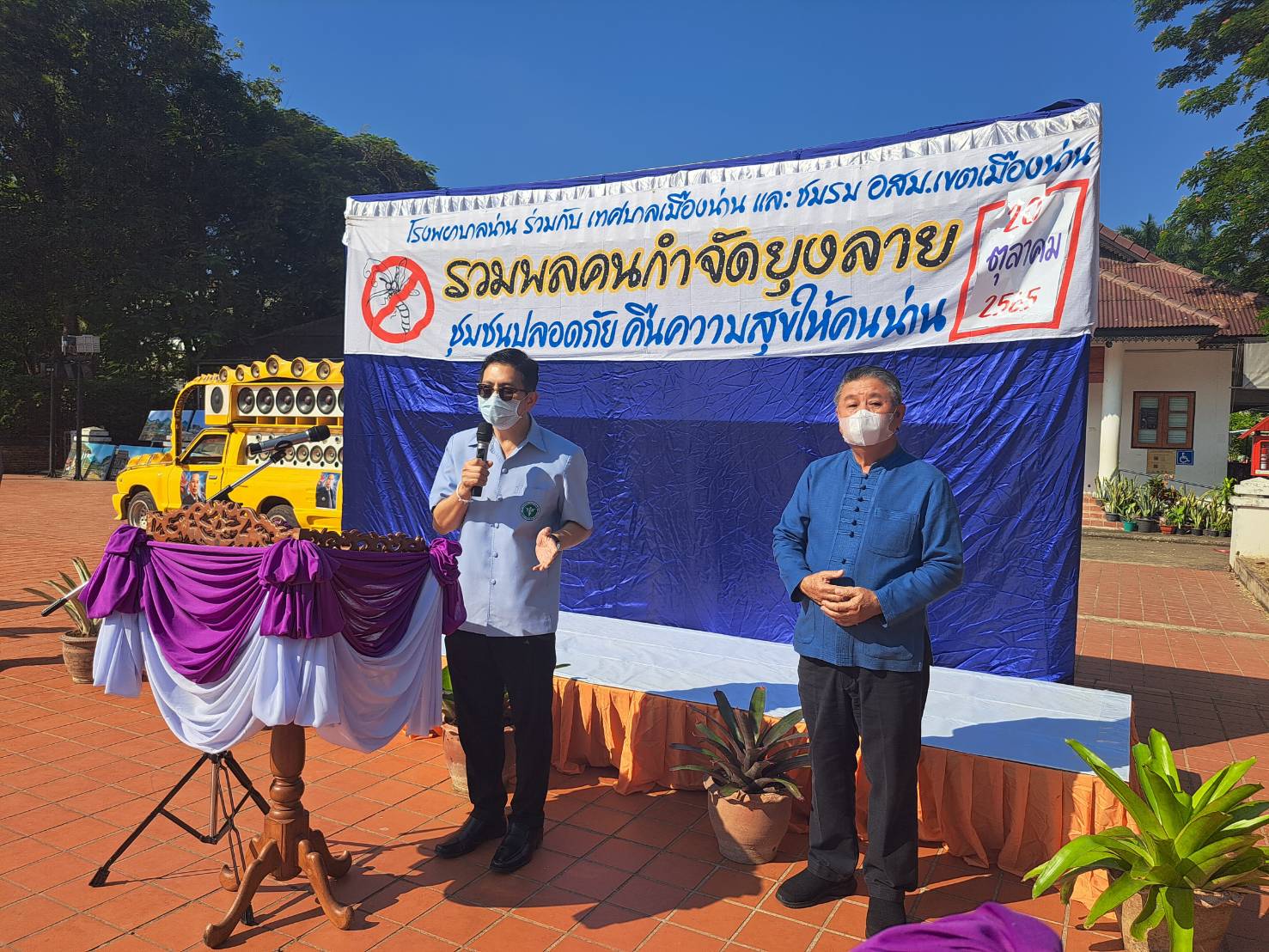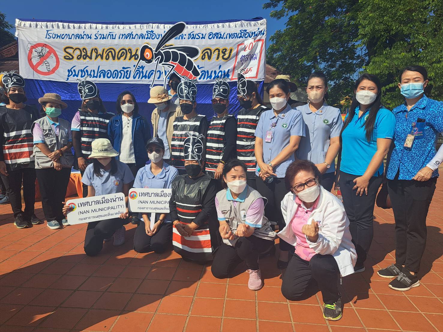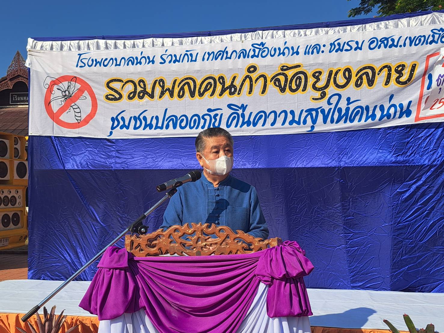 ที่  ลานข่วงเมืองน่าน หน้าวัดภูมินทร์ ต.ในเวียง อ.เมืองน่าน จ.น่าน นายแพทย์วสันต์ แก้ววี ผู้อำนวยการโรงพยาบาลน่าน กล่าวรายงานต่อ นายสุรพล เธียรสูตร นายกเทศมนตรีเมืองน่านในการเปิดงานการจัดกิจกรรมรณรงค์จิตอาสาพัฒนาสิ่งแวดล้อมกำจัดแหล่งเพาะพันธุ์ยุงลาย ประจำปีงบประมาณ 2566 วันที่ 20 ตุลาคม 2565 โดยมีวัตถุประสงค์ มุ่งเน้นกิจกรรมการพัฒนาแหล่งน้ำที่เน่าเสีย การกำจัดขยะหรือบริเวณที่มีน้ำขัง เพื่อกำจัดแหล่งเพาะพันธุ์ยุงลาย และจากสถานการณ์การแพร่ระบาดของโควิด 19 ส่งผลต่อสถานที่สาธารณะที่ไม่ได้ดำเนินการกำจัดแหล่งเพาะพันธุ์ยุงลาย ดังนั้นโรงพยาบาลน่านจึงจะดำเนินการร่วมกับกองสาธารณสุขเทศบาลเมืองน่าน อสม. และโรงเรียนในเขตเทศบาลเมืองน่าน ในการกำจัดแหล่งเพาะพันธุ์ยุงลายในสถานที่ 7 ร. ได้แก่ โรงเรียน โรงงาน โรงธรรม โรงเรือน โรงแรม โรงพยาบาล และสถานที่ราชการ ซึ่งจะส่งผลให้สถานการณ์โรคไข้เลือดออกลดลงอย่างชัดเจน เพื่อทำความดีถวายเป็นพระราชกุศล เนื่องในวันคล้ายวันสวรรคต พระบาทสมเด็จพระบรมชนกาธิเบศร มหาภูมิพลอดุลยเดชมหาราช บรมนาถบพิตร
