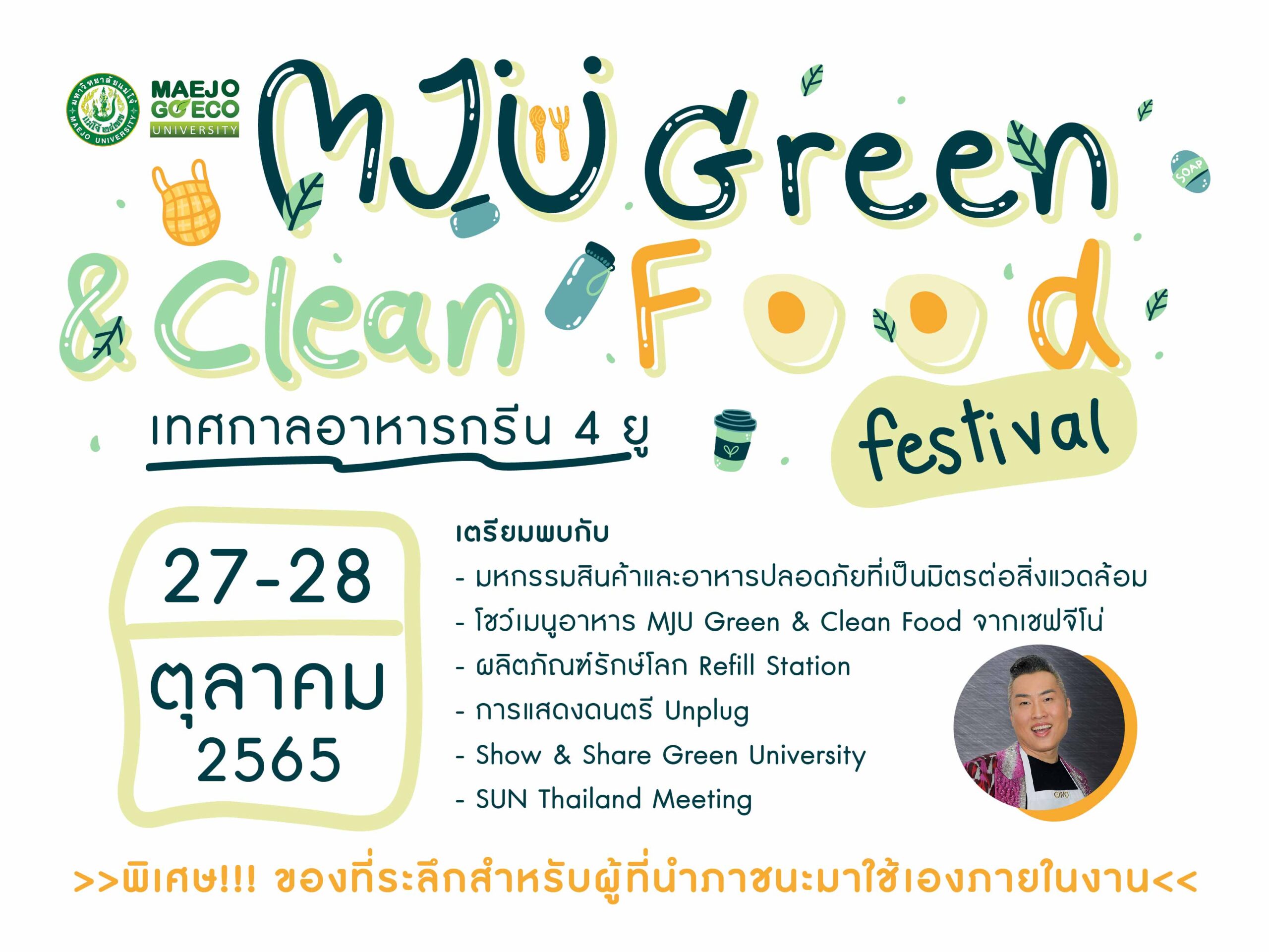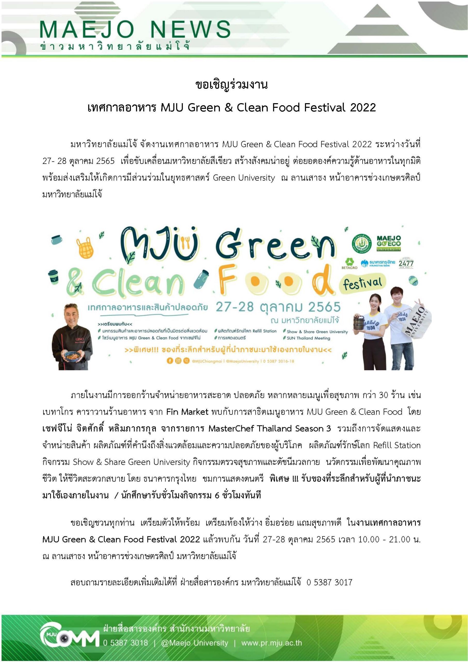 มหาวิทยาลัยแม่โจ้ จัดงานเทศกาลอาหาร MJU Green & Clean Food Festival 2022 ระหว่างวันที่ 27- 28 ตุลาคม 2565 เพื่อขับเคลื่อนมหาวิทยาลัยสีเขียว สร้างสังคมน่าอยู่ ต่อยอดองค์ความรู้ด้านอาหารในทุกมิติ พร้อมส่งเสริมให้เกิดการมีส่วนร่วมในยุทธศาสตร์ Green University ที่ลานเสาธง หน้าอาคารช่วงเกษตรศิลป์ มหาวิทยาลัยแม่โจ้