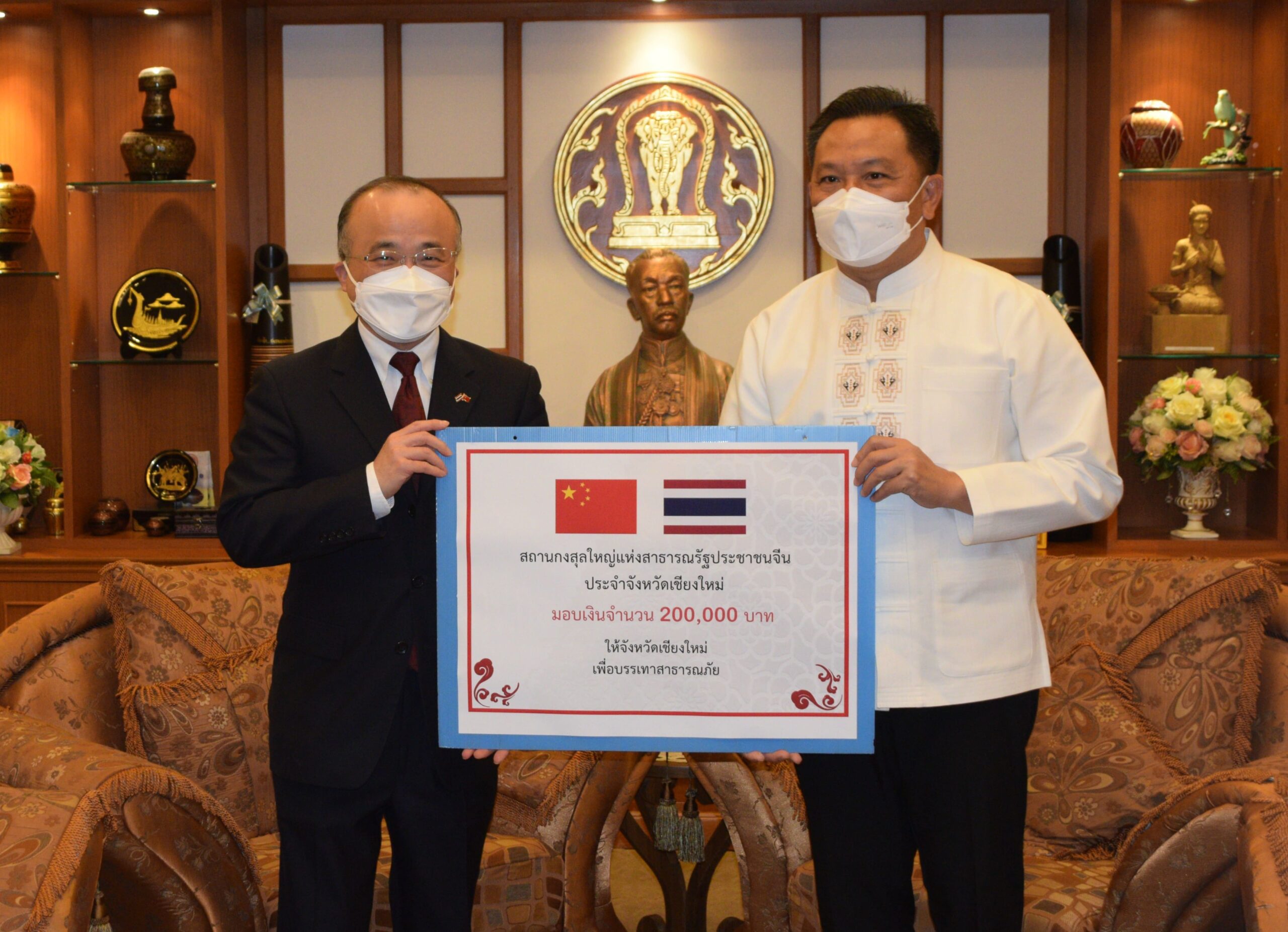 พร้อมกันนี้ นายอู๋ จื้ออู่ กงสุลใหญ่สาธารณรัฐประชาชนจีน ประจำเชียงใหม่ ได้มอบเงินสนับสนุนช่วยเหลือในการบรรเทาสาธารณภัยในพื้นที่จังหวัดเชียงใหม่ จำนวน 200,000 บาท โดยจังหวัดเชียงใหม่ จะนำเงินดังกล่าว ไปใช้ให้เป็นไปตามวัตถุประสงค์ และระเบียบของกฎหมาย เพื่อให้เกิดประโยชน์สูงสุด ต่อผู้ประสบภัยต่าง ๆ ในจังหวัดเชียงใหม่ต่อไป