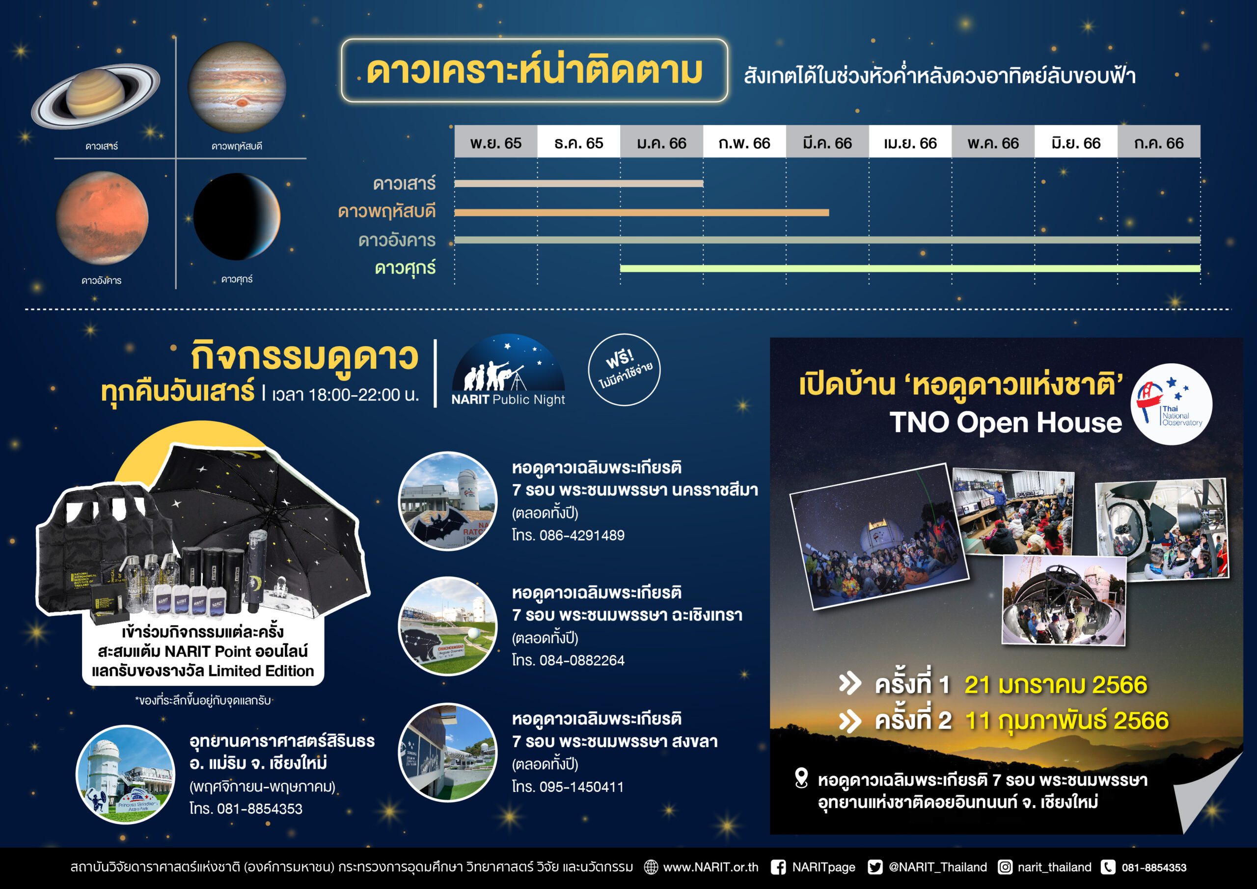 8) TNO Open House : เปิดบ้านหอดูดาวแห่งชาติ ชวนประชาชนร่วมสัมผัสเทคโนโลยีกล้องโทรทรรศน์ ขนาดเส้นผ่านศูนย์กลาง 2.4 เมตร ใหญ่และทันสมัยที่สุดในภูมิภาคเอเชียตะวันออกเฉียงใต้ และชมดาวเคราะห์ผ่านกล้องโทรทรรศน์ขนาดเส้นผ่านศูนย์กลาง 1 เมตร ณ หอดูดาวเฉลิมพระเกียรติ 7 รอบ พระชนมพรรษา หรือ หอดูดาวแห่งชาติ บนอุทยานแห่งชาติดอยอินทนนท์ จ. เชียงใหม่ พร้อมเยี่ยมชมห้องทำงานของนักดาราศาสตร์ จัด 2 ครั้ง/ ปี ครั้งที่ 1 วันเสาร์ที่ 21 มกราคม 2566 และครั้งที่ 2 วันเสาร์ที่ 11 กุมภาพันธ์ 2566 ติดตามการรับสมัครออนไลน์ทาง https://www.facebook.com/NARITPage