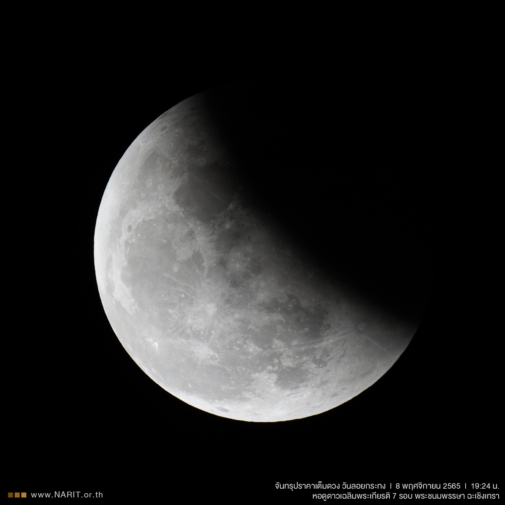 สถาบันวิจัยดาราศาสตร์แห่งชาติ (องค์การมหาชน) (สดร.) กระทรวงการอุดมศึกษา วิทยาศาสตร์ วิจัยและนวัตกรรม (อว.) เผยภาพลำดับเหตุการณ์ปรากฏการณ์จันทรุปราคาเต็มดวงเหนือฟ้าเมืองไทยคืนวันลอยกระทง 8 พฤศจิกายน 2565 บันทึกภาพในช่วงเวลาประมาณ 18:30 น. – 21:00 น.