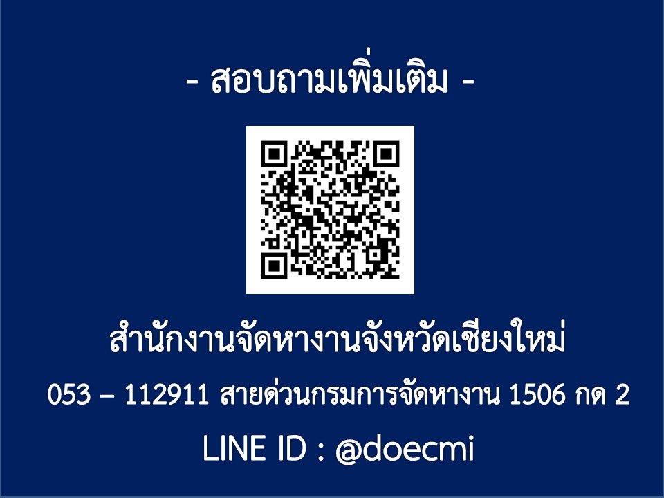 หากมีข้อสงสัย สอบถามรายละเอียดเพิ่มเติมได้ที่ ฝ่ายพิจารณาการอนุญาตทำงานของคนต่างด้าว สำนักงานจัดหางานจังหวัดเชียงใหม่ สาขาย่อย (ศูนย์สินค้าเกษตรภาคเหนือจังหวัดเชียงใหม่) หมายเลขโทรศัพท์ 0-5311-2911 หรือสายด่วนกรมการจัดการ 1506 กด 2 หรือช่องทาง Line official ID : @doecmi